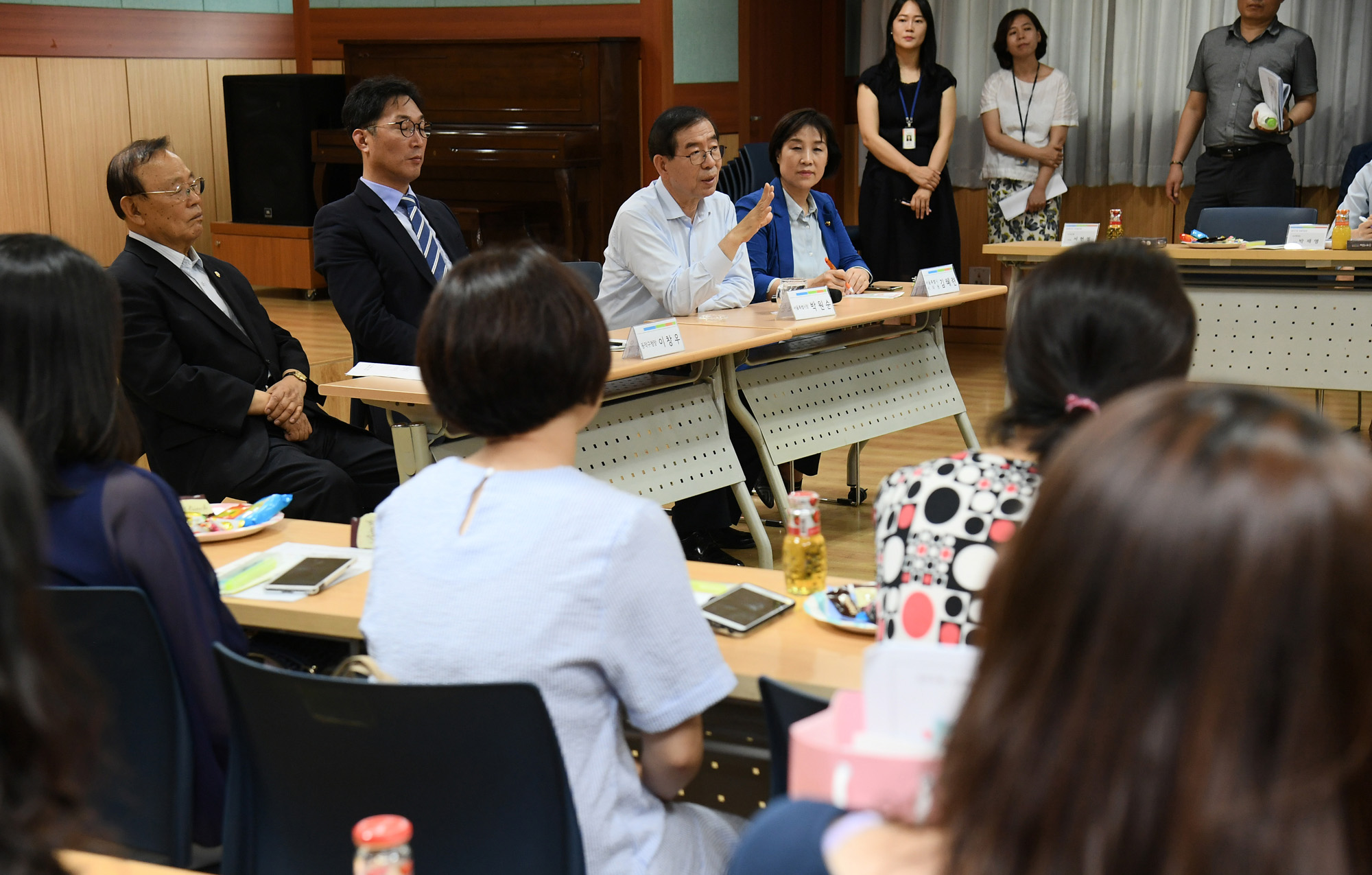 박원순 서울시장이 20일 서울 동작문화복지센터를 방문해 관계자들에게 종합행정타운 건립 예정지 설명을 듣고 있다. 서울시 제공
