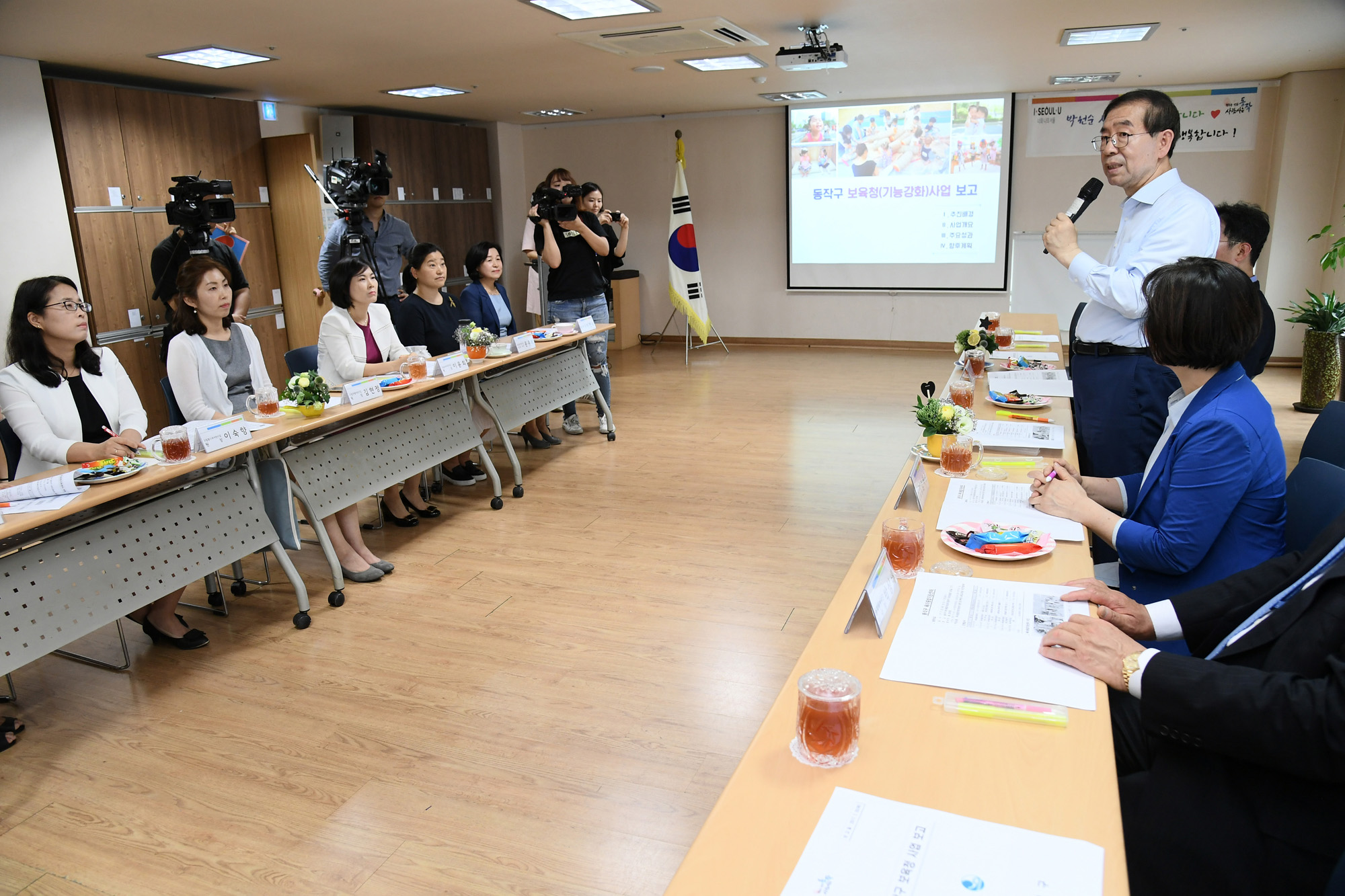 박원순 서울시장이 20일 서울 동작문화복지센터를 방문해 관계자들에게 종합행정타운 건립 예정지 설명을 듣고 있다. 서울시 제공