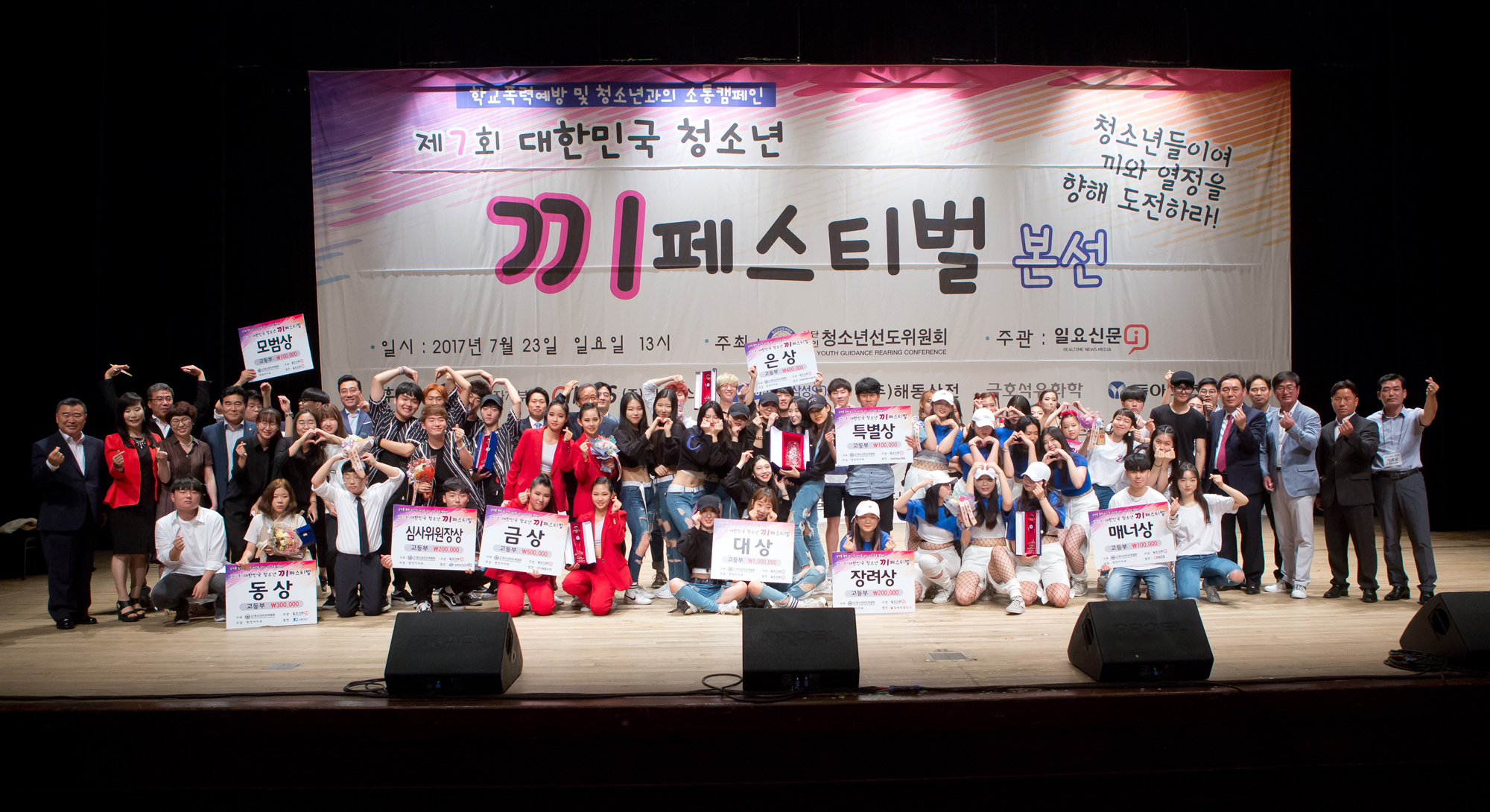 “청소년들의 끼와 열정의 무대” ‘제7회 대한민국 청소년 끼 페스티벌’ 본선대회가 23일 오후 서울 광진구 유니버설아트센터에서 펼쳐지고 있다. (사)청소년선도위원회가 주최하고 <일요신문i>가 주관, 행정자치부가 후원하는 이번 행사는 학교폭력 예방 및 청소년과의 소통을 위한 캠페인의 일환으로 청소년들의 문화적 공감대 확산 및 잠재돼 있는 끼와 재능을 뽐내는 청소년들의 열린 장이다. 사진은 고등부 시상식 2017.07.23 사진/임준선기자 |