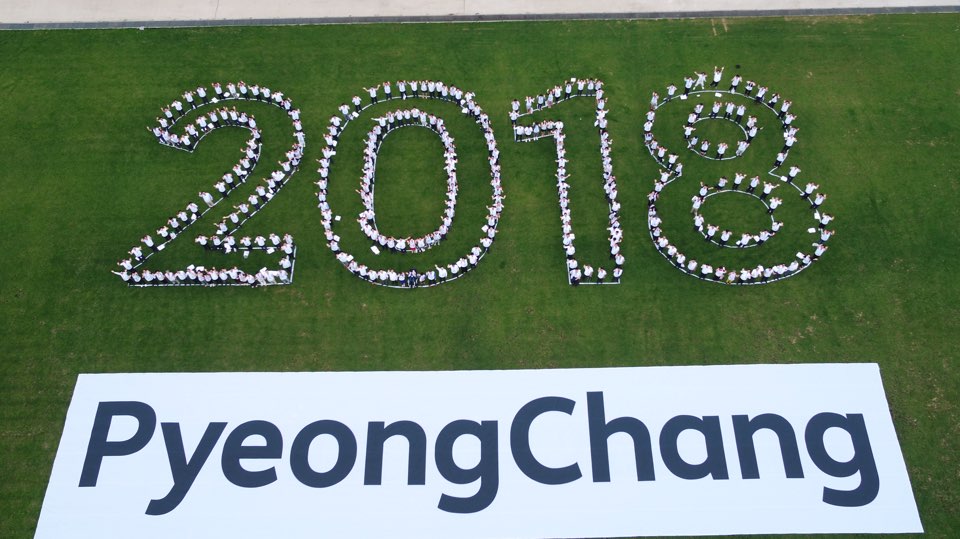 문재인 대통령과 참석자들이 24일 오후 평창 알펜시아 리조트에서 열린 'G-200, 2018, 평창을 준비하는 사람들' 평창동계올림픽·패럴림픽 성공 다짐대회를 마치고 드론을 이용한 홍보영상을 촬영하고 있다.