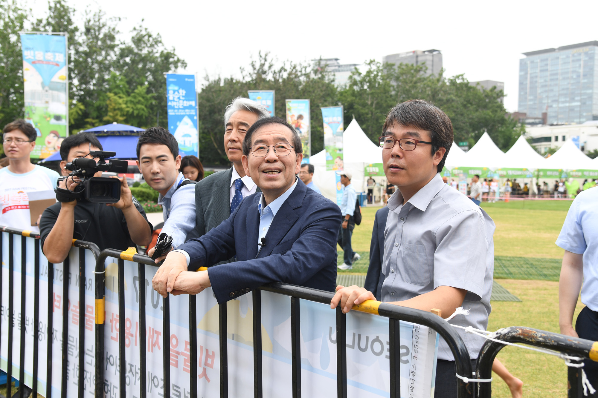 27일 오전 서울광장에서 열린 '2017 서울 물순환 시민 문화제'. 박원순 서울시장이 구름조형물 앞에서 시민들과 함께 기념촬영을 하고 있다. 서울시 제공