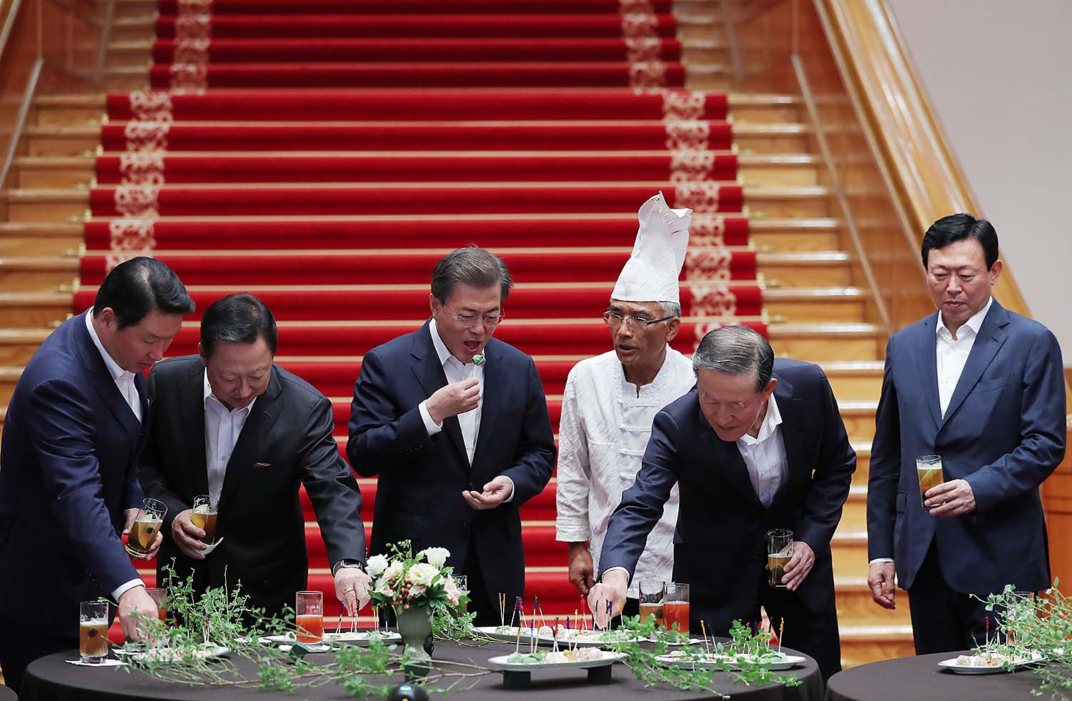 문재인 대통령이 28일 오후 청와대 본관 로비에서 열린 주요 기업인과의 칵테일 타임에서 참석자들과 대화를 나누고 있다. 이날 간담회에는 삼성전자 권오현 부회장, SK 최태원 회장, 롯데 신동빈 회장, GS 허창수 회장, 현대중공업 최길선 회장, KT 황창규 회장, 대한항공 조원태 사장이 참석했다. 2017.7.28 사진/청와대제공 |