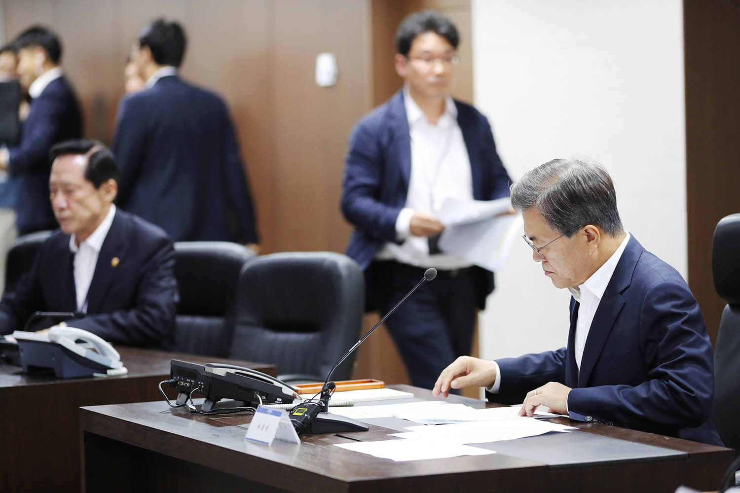 문재인 대통령이 29일 오전 북한 미사일 발사와 관련해 긴급 국가안전보장회의(NSC) 전체회의를 소집하고 있다.