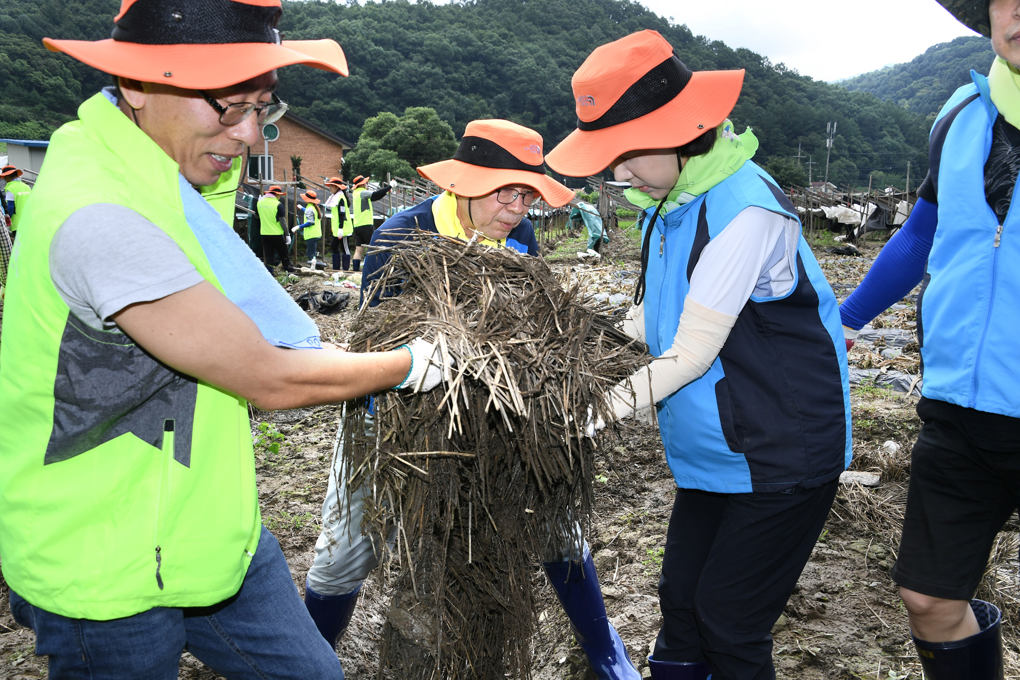 박원순 서울시장과 서울시 공무원, 시 자원봉사자 등 310여명이 집중호우로 큰 피해가 난 충북 괴산군 청천면 일원에서 30일 복구작업을 도왔다. 서울시 제공