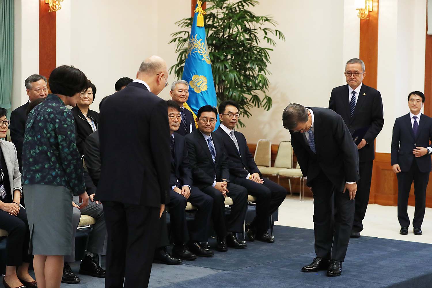 문재인 대통령이 8일 오전 청와대 본관 충무실에서 이효성 신임 방송통신위원장에게 임명장을 수여하고 있다. 2017.8.8 사진/청와대제공