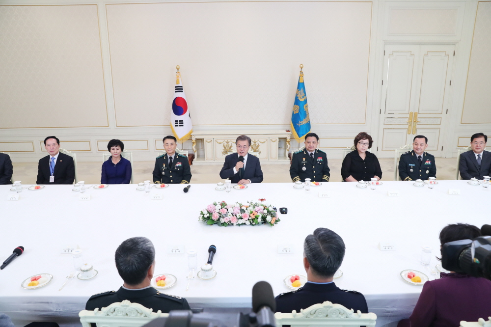 문재인 대통령이 9일 오전 청와대 본관 인왕실에서 열린 군 장성 진급 및 보직 신고식을 마친후 환담을 나누고 있다. 2017.8.9 사진/청와대제공