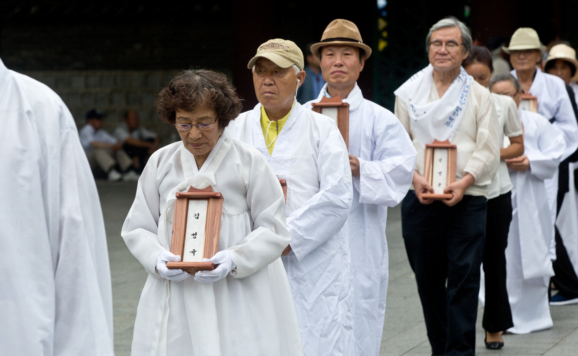 [서울=eoimage] 고성준 기자 = 일제 강제징용 희생자 유해봉환위원회가 광복절을 하루 앞둔 14일 오후 일제 강제징용 희생자들의 위패를 들고 서울 탑골공원에서 행진하고 있다.2017.8.14