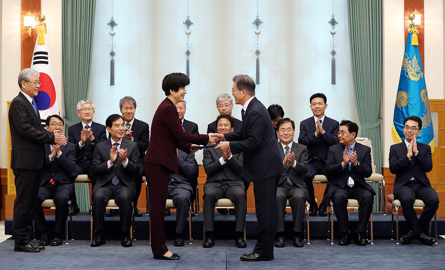 문재인 대통령이 14일 오전 청와대 본관 충무실에서 김영주 신임 고용노동부 장관에게 임명장을 수여하고 있다. 2017.8.14
