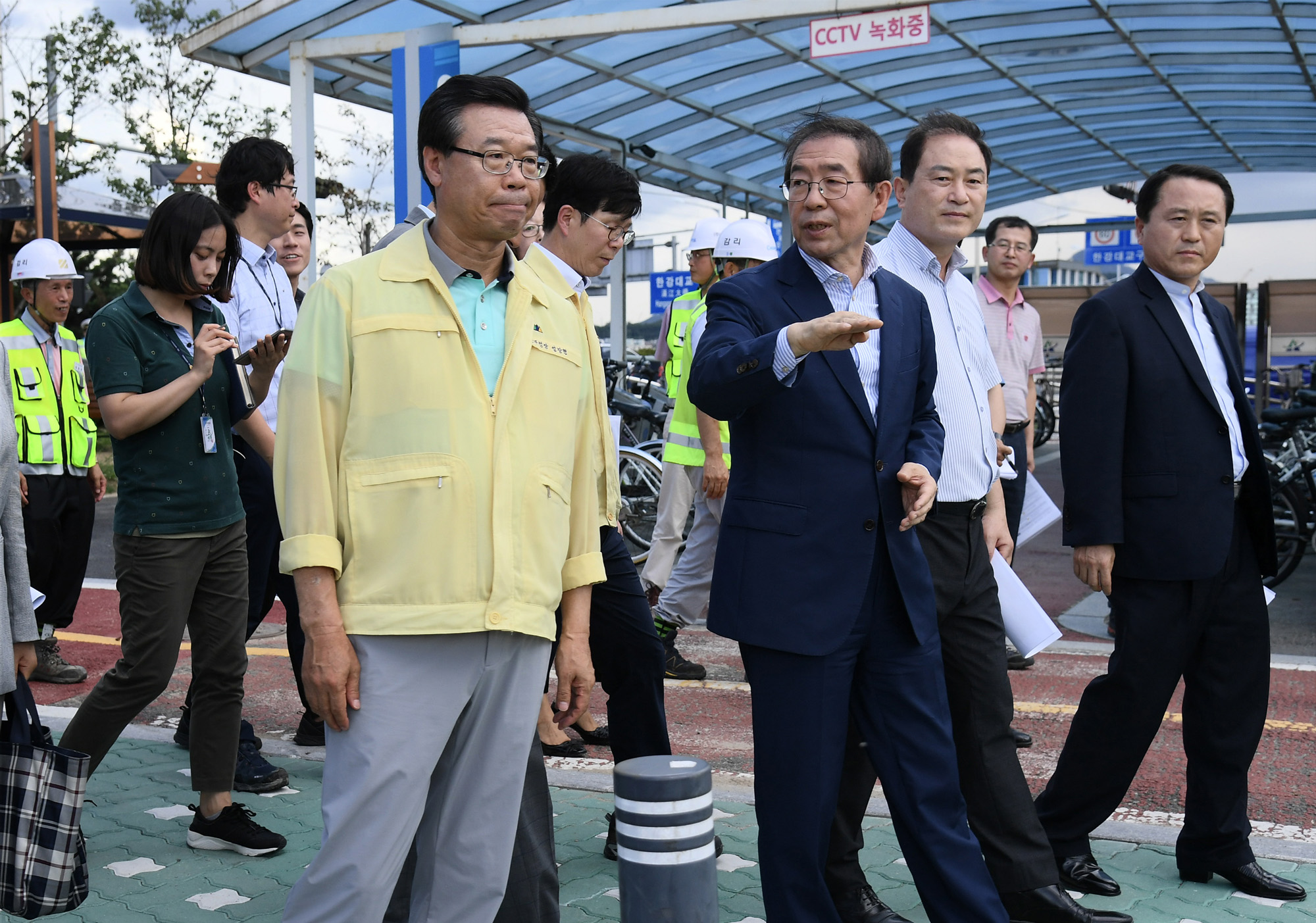 박원순 서울시장이 11일 오후 용산구 이촌로 한강로 일대 방재시설 확충공사 현장을 방문해 근로자들을 격려하고 있다. 서울시 제공