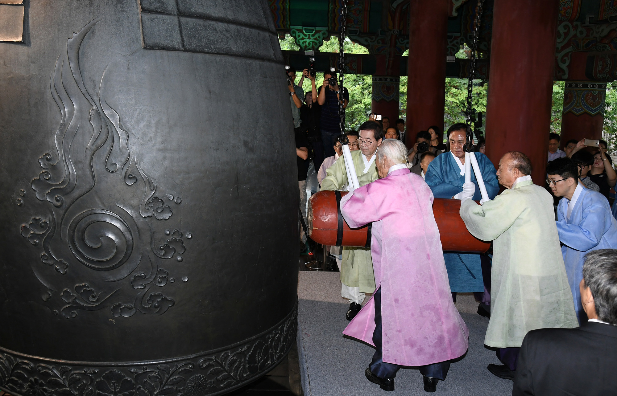 15일 오전 서울 종로구 보신각에서 열린 광복절 기념 타종행사에서 박원순 시장이 타종을 하고 있다. 서울시 제공