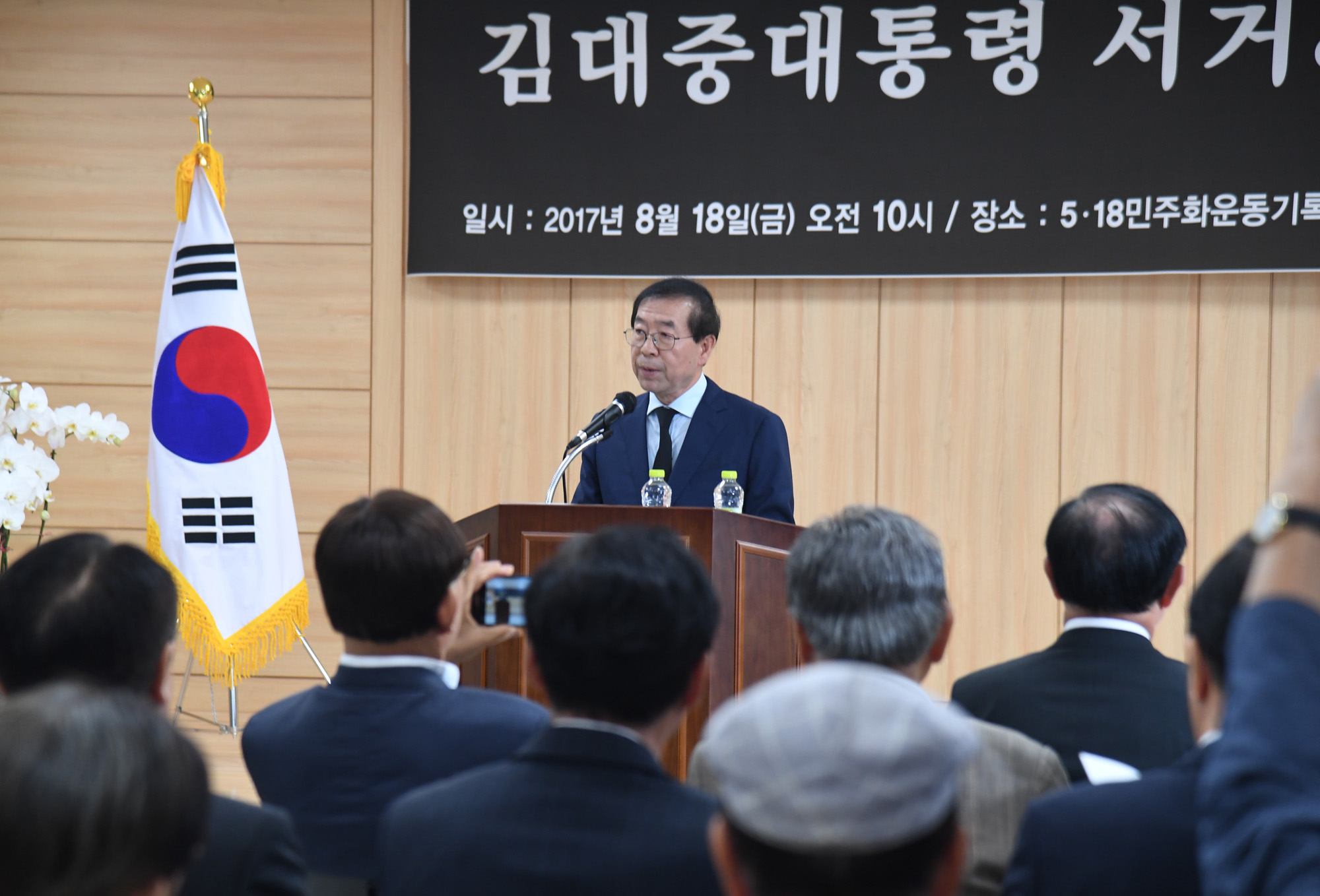 박원순 서울시장이 18일 오전 광주 동구 금남로 5·18민주화운동기록관에서 열린 김대중 전 대통령 서거 8주기 추모식에서 추도사를 하고 있다. 서울시 제공