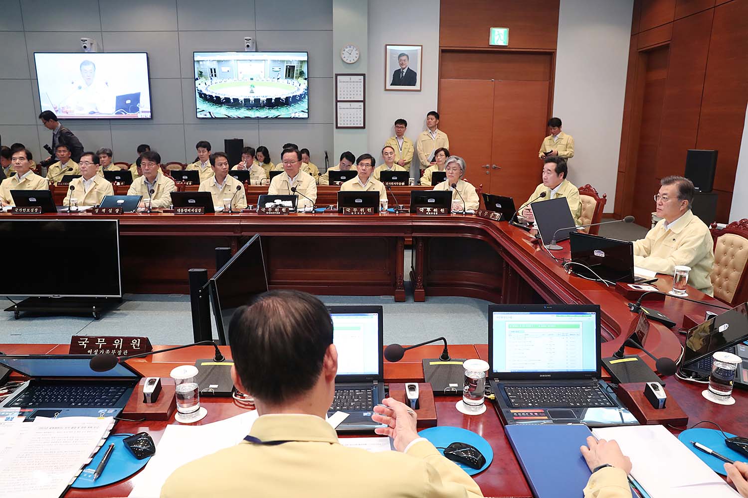 문재인 대통령이 21일 오전 청와대 영상회의실에서 열린 제1회 을지국무회의 겸 제37회 국무회의를 주재하고 있다.