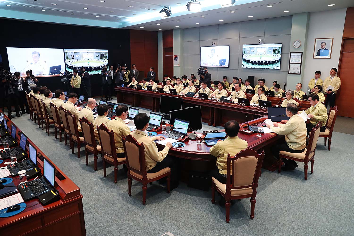 문재인 대통령이 21일 오전 청와대 영상회의실에서 열린 제1회 을지국무회의 겸 제37회 국무회의를 주재하고 있다.