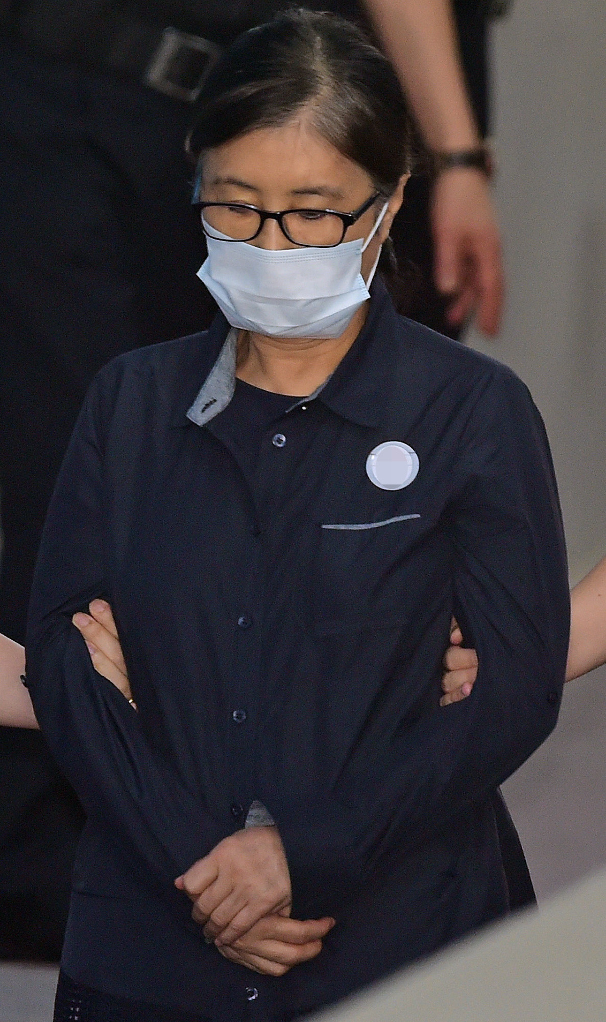 최순실 씨가 25일 서울 서초동 서울중앙지법에서 열린 공판에 출석하기 위해 호송차에서 내려 법정으로 향하고 있다.