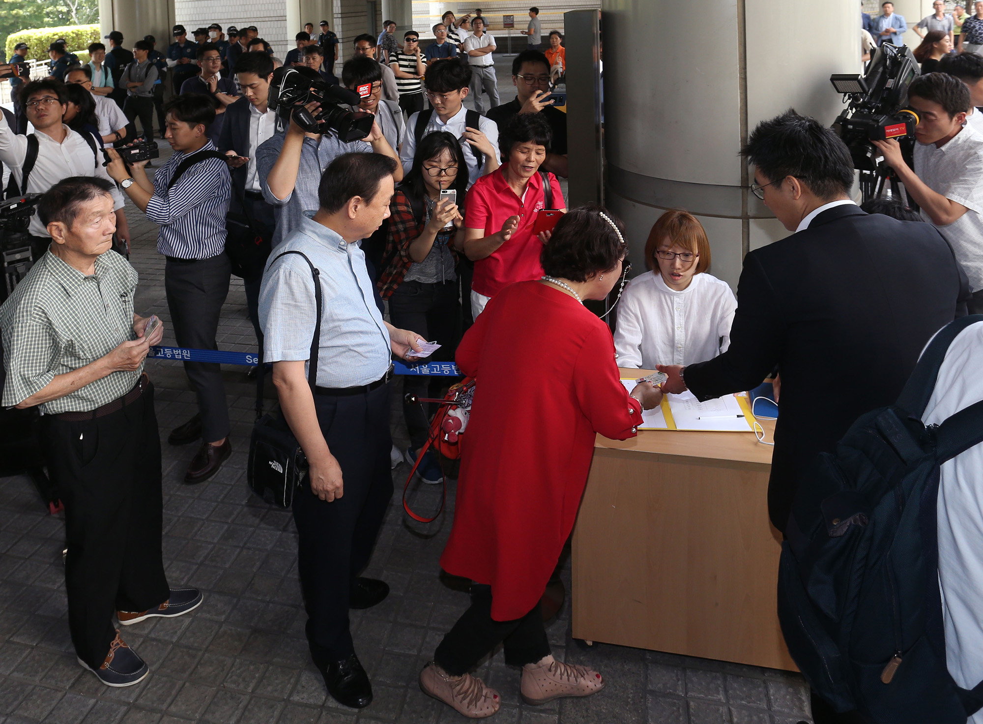 뇌물수수혐의로 구속기소된 이재용 삼성전자 부회장의 1심 선고공판이 열린 25일 서울 서초구 서울지방법원에서 추첨에 당첨된 방청객들이 방청권을 교부받기 위해 대기하고 있다.