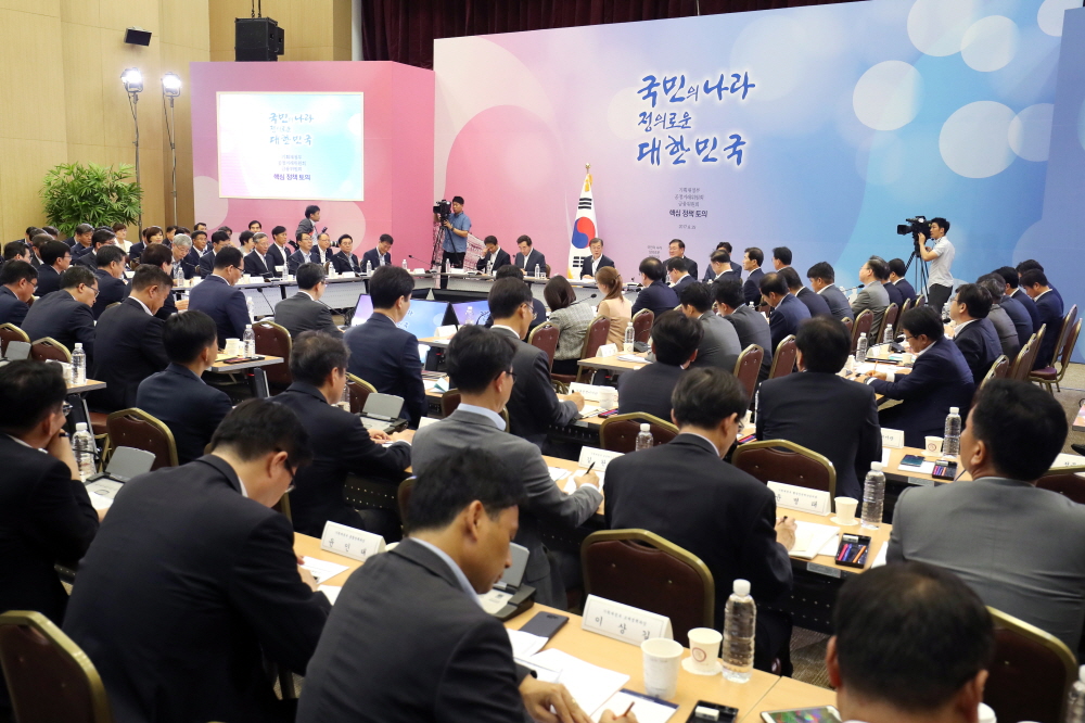문재인 대통령이 25일 오후 정부 세종청사에서 기획재정부와 공정거래위원회, 금융위원회로부터 세 번째 업무보고를 받았다.