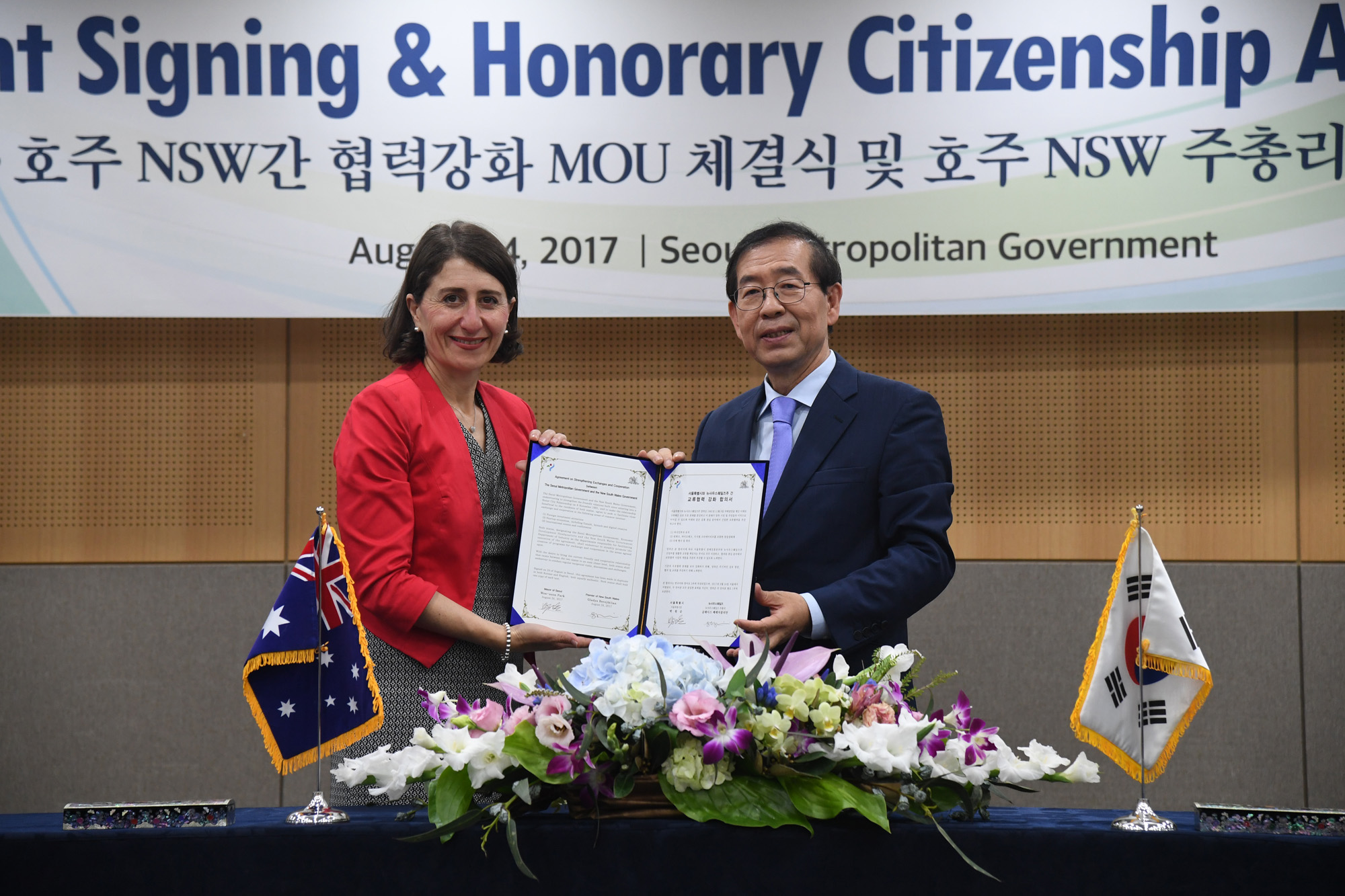 박원순 서울시장이 24일 오전 서울시청 영상회의실에서 글래디스 베레지클리안 호주 뉴사우스웨일즈주(州) 총리에게 명예시민증을 수여하고 있다. 서울시 제공
