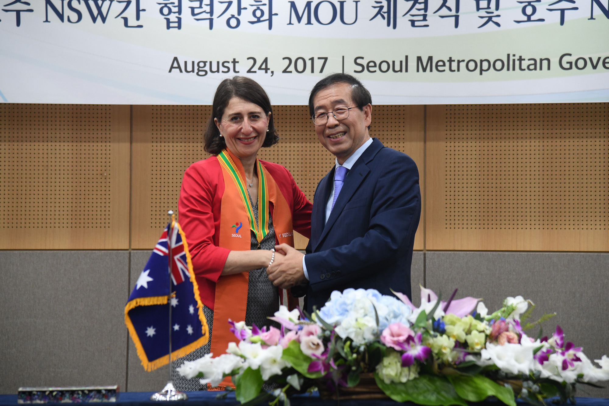 박원순 서울시장이 24일 오전 서울시청 영상회의실에서 글래디스 베레지클리안 호주 뉴사우스웨일즈주(州) 총리에게 명예시민증을 수여하고 있다. 서울시 제공