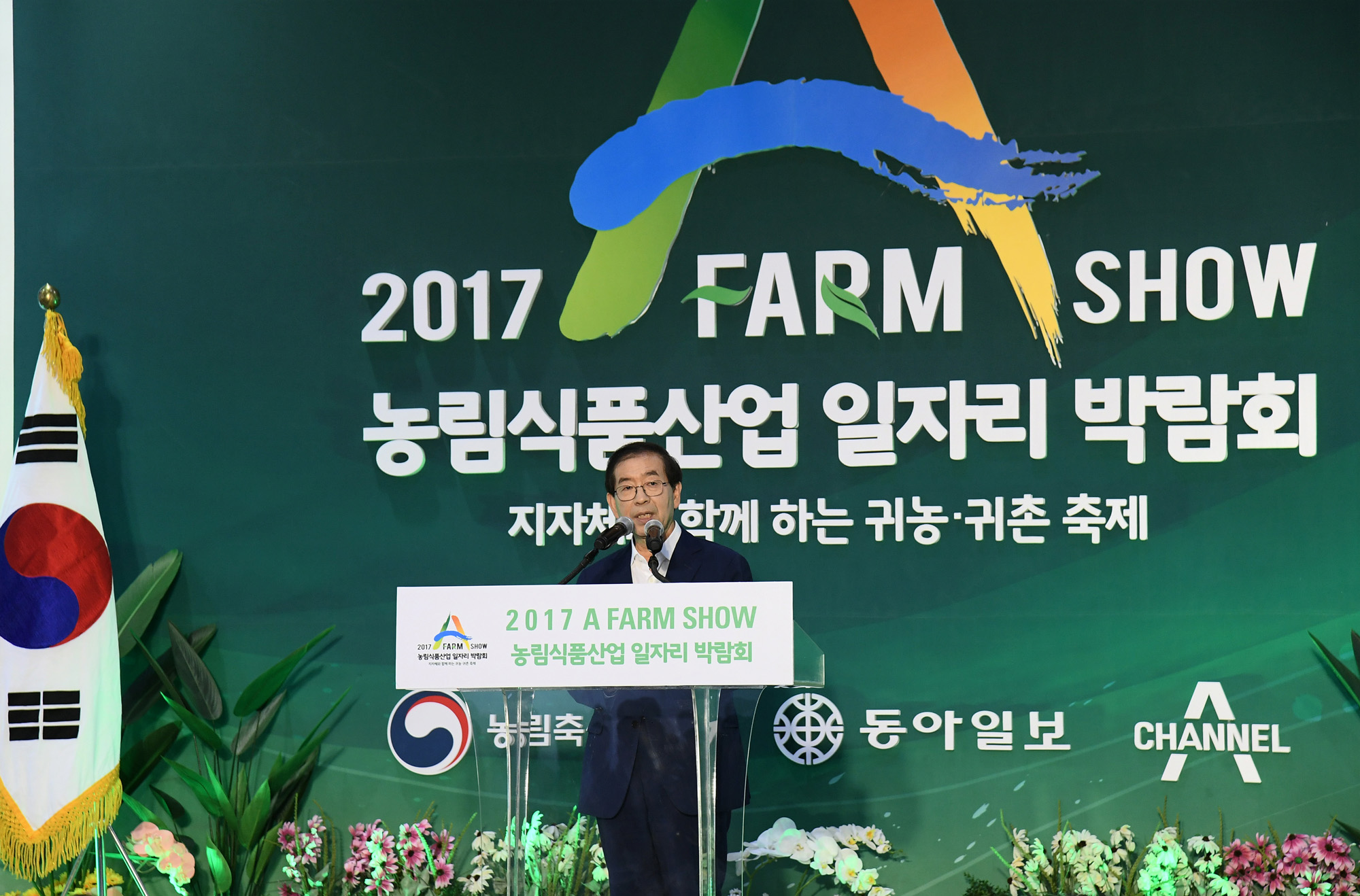 박원순 서울시장이 25일 서울 서초구 aT 센터에서 열린 '2017 A Farm Show 농림식품산업 일자리 박람회'에서 축사를 하고 있다. 서울시 제공