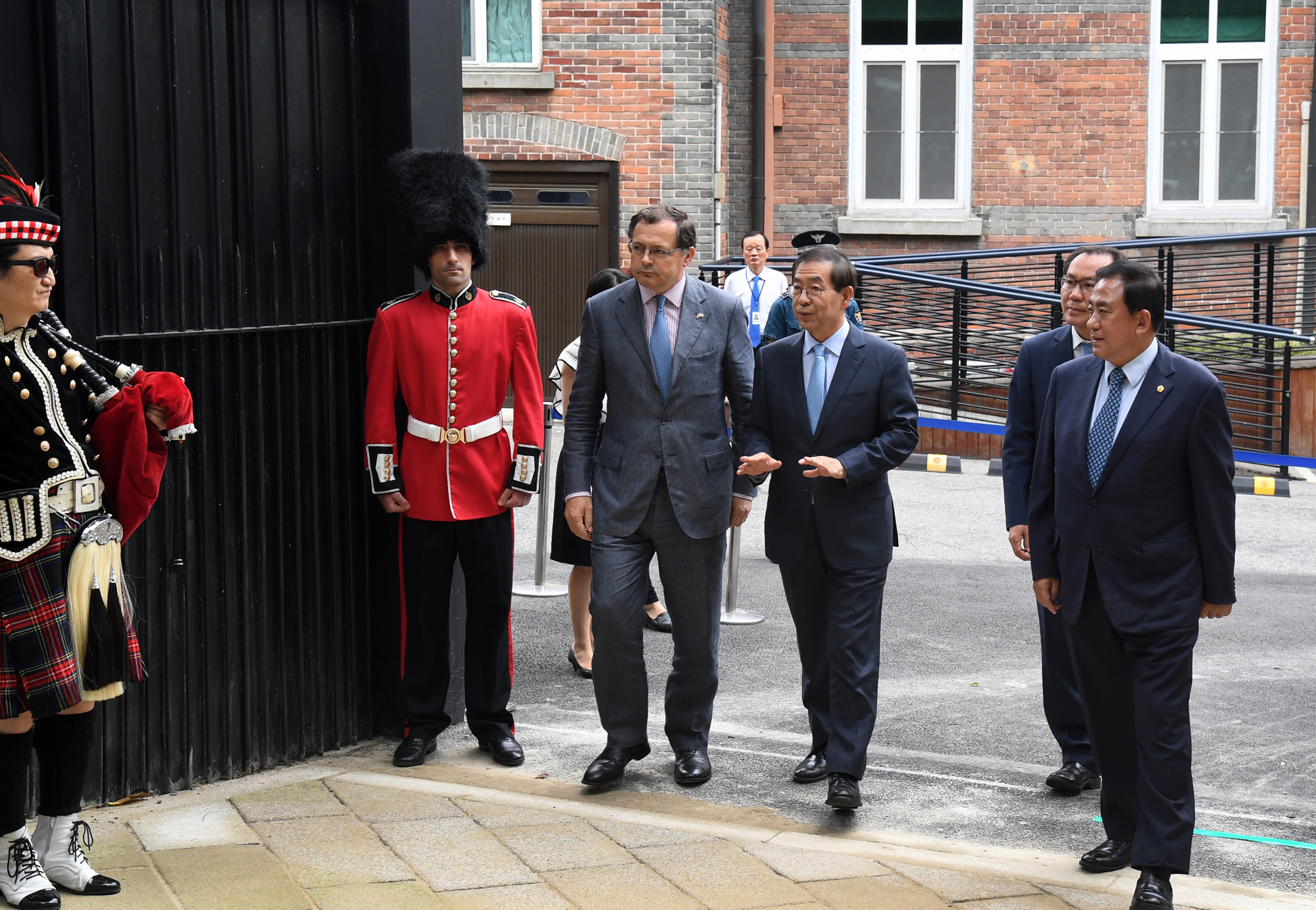 박원순 서울시장, 찰스 헤이 주한 영국대사 등 참석자들이 30일 오전 서울 중구 영국대사관 신규 후문 앞에서 덕수궁 돌담길 개방식을 마치고 돌담길을 걸으며 사진전을 보고 있다. 서울시 제공