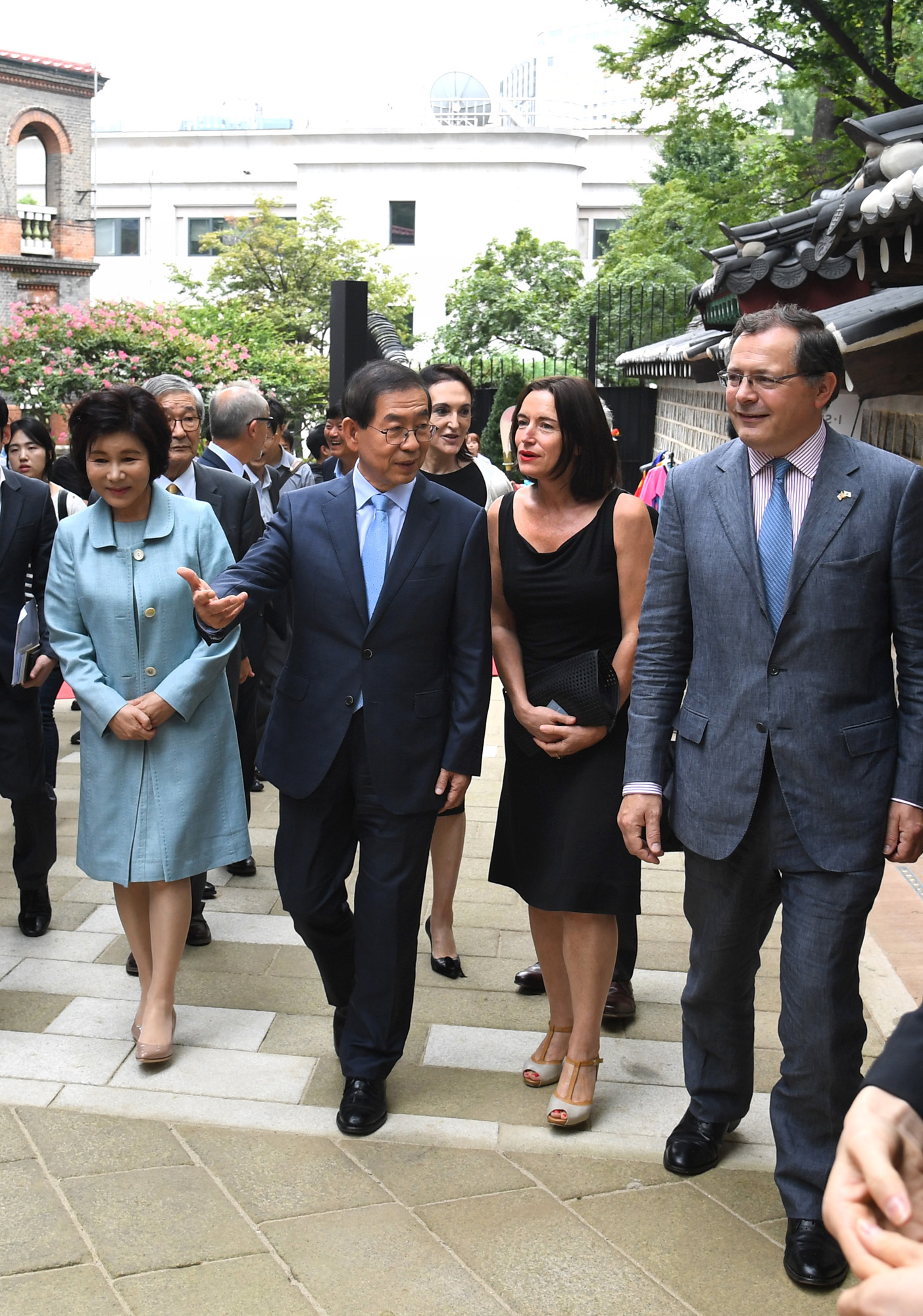 박원순 서울시장, 찰스 헤이 주한 영국대사 등 참석자들이 30일 오전 서울 중구 영국대사관 신규 후문 앞에서 덕수궁 돌담길 개방식을 마치고 돌담길을 걸으며 사진전을 보고 있다. 서울시 제공