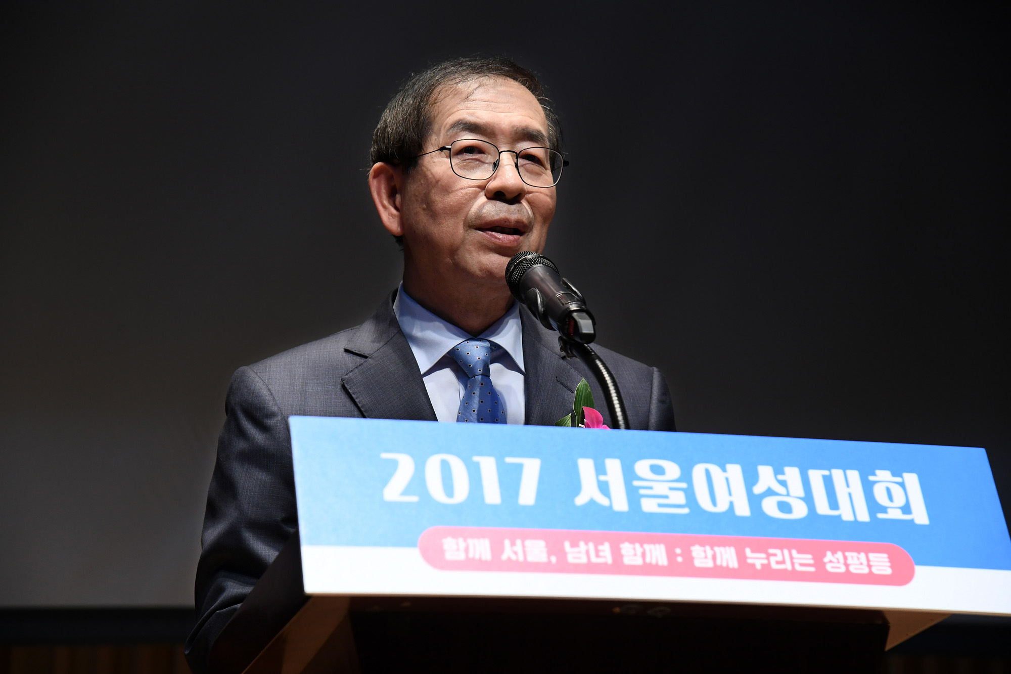 박원순 서울시장이 31일 오후 서울 중구 서울시청 다목적홀에서 열린 '2017 서울여성대회'에서 시상을 하고 있다. 서울시 제공