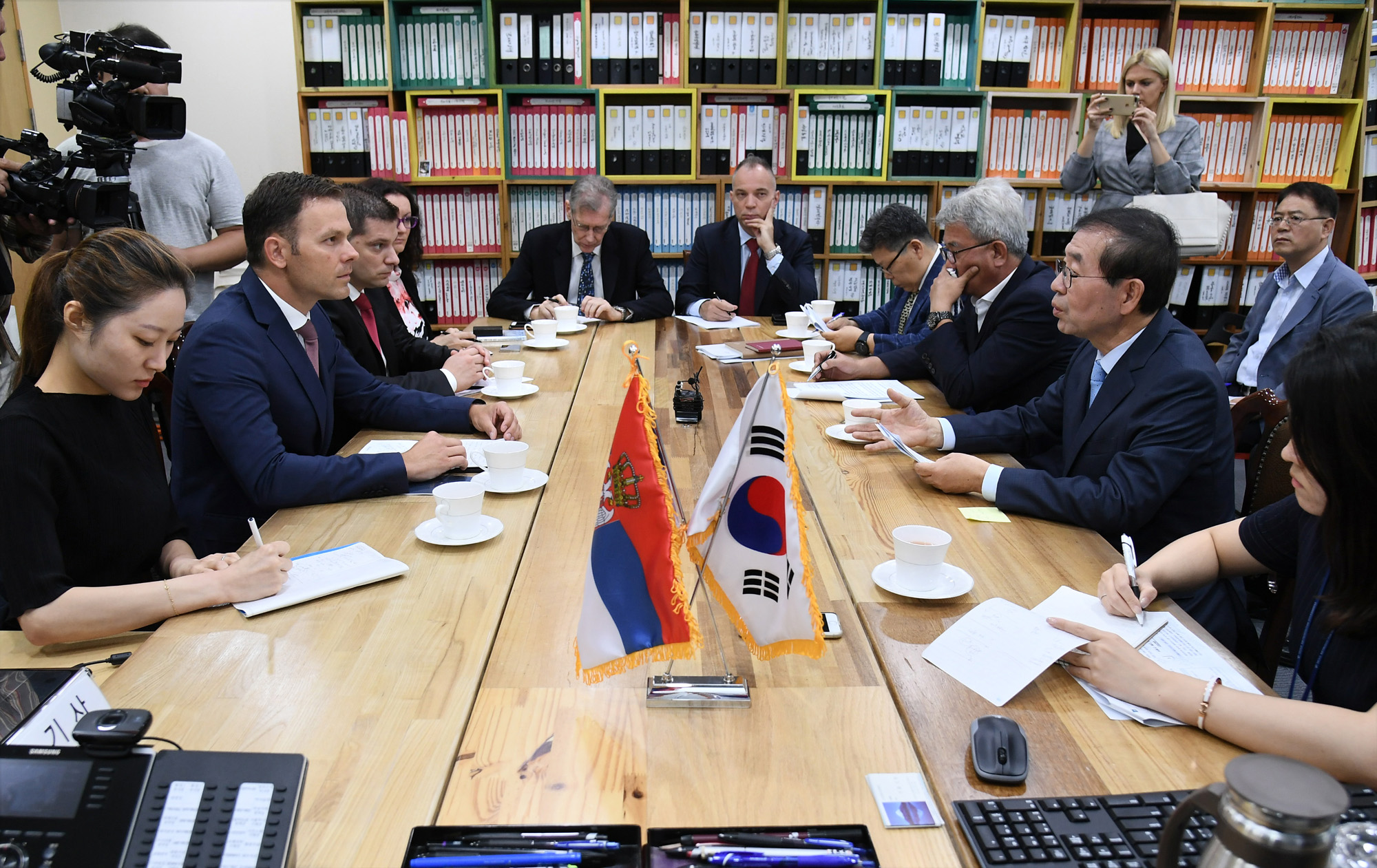 박원순 서울시장이 31일 서울시청을 찾은 세르비아 베오그라드의 시니샤 말리 시장과 대화를 나누고 있다. 서울시 제공