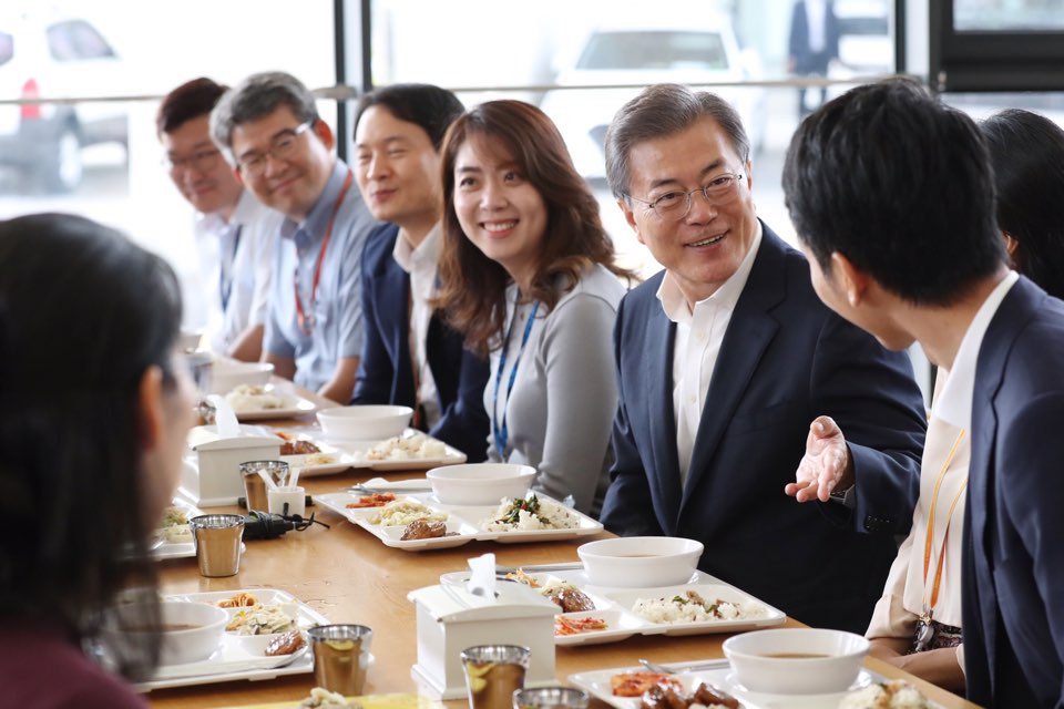 문재인 대통령은 31일 정부세종청사에서 다자녀 공무원들과 점심식사를 함께 하고 있다.