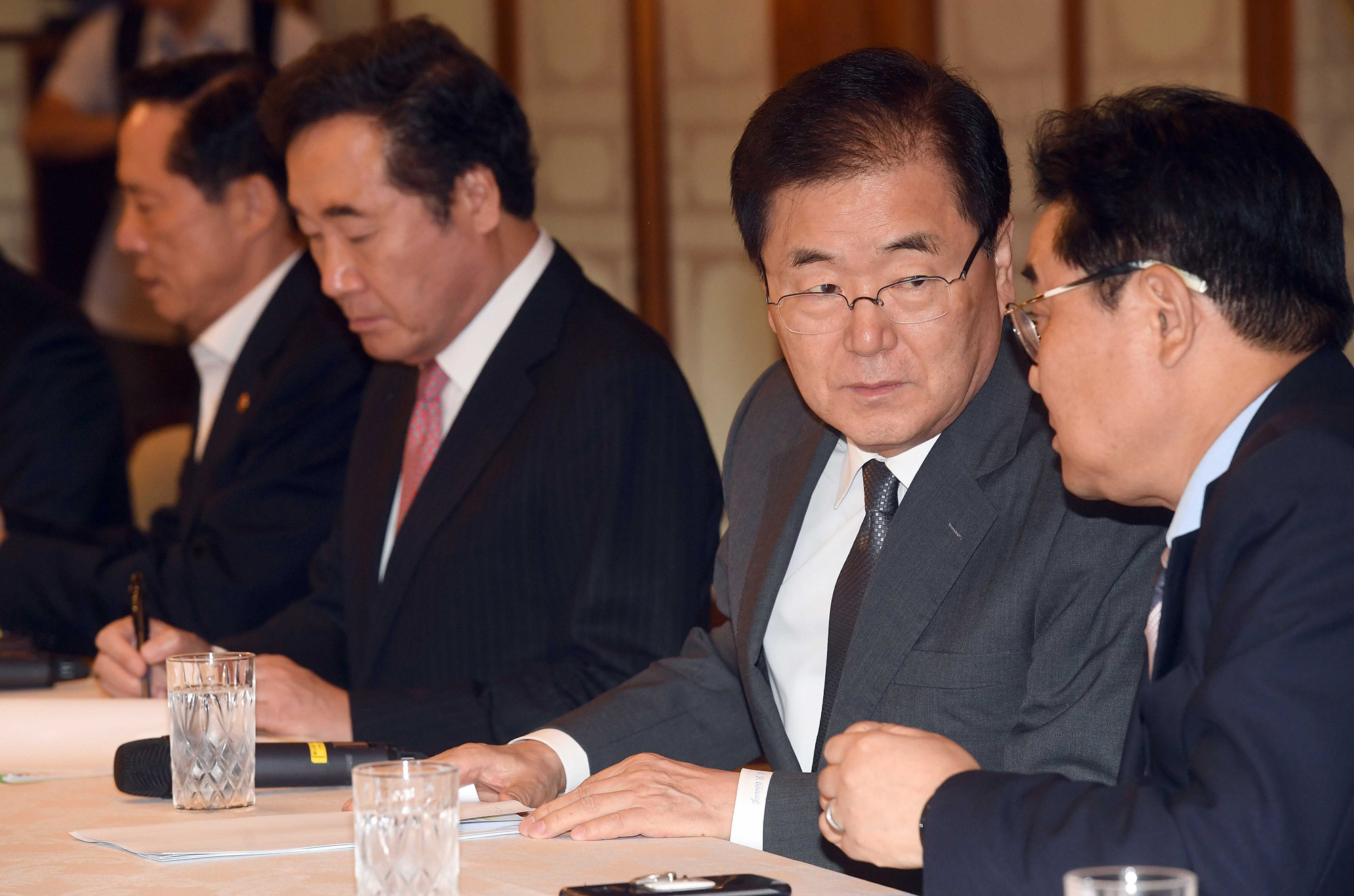 5일 삼청동 총리공관에서 열린 북핵관련 긴급 당,정,청 회의에 참석한 정의용 국가안보실장이 참석자들과 심각한 표정으로 이야기를 나누고 있다./이호재기자.