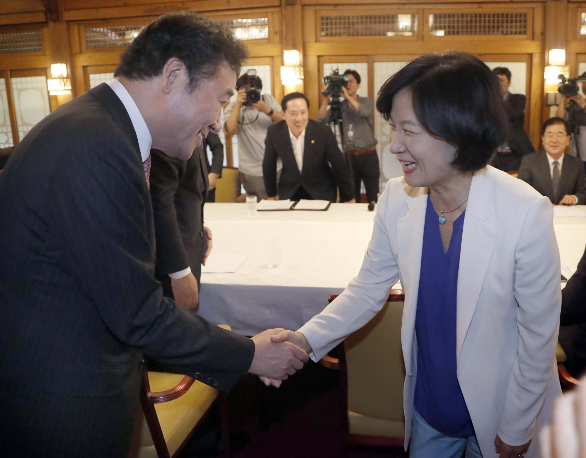 이낙연 국무총리와 더불어민주당 추미애 대표가 5일 오후 서울 삼청동 총리공관에서 열린 안보 관련 고위 당정청 회의에서 인사를 하고 있다.