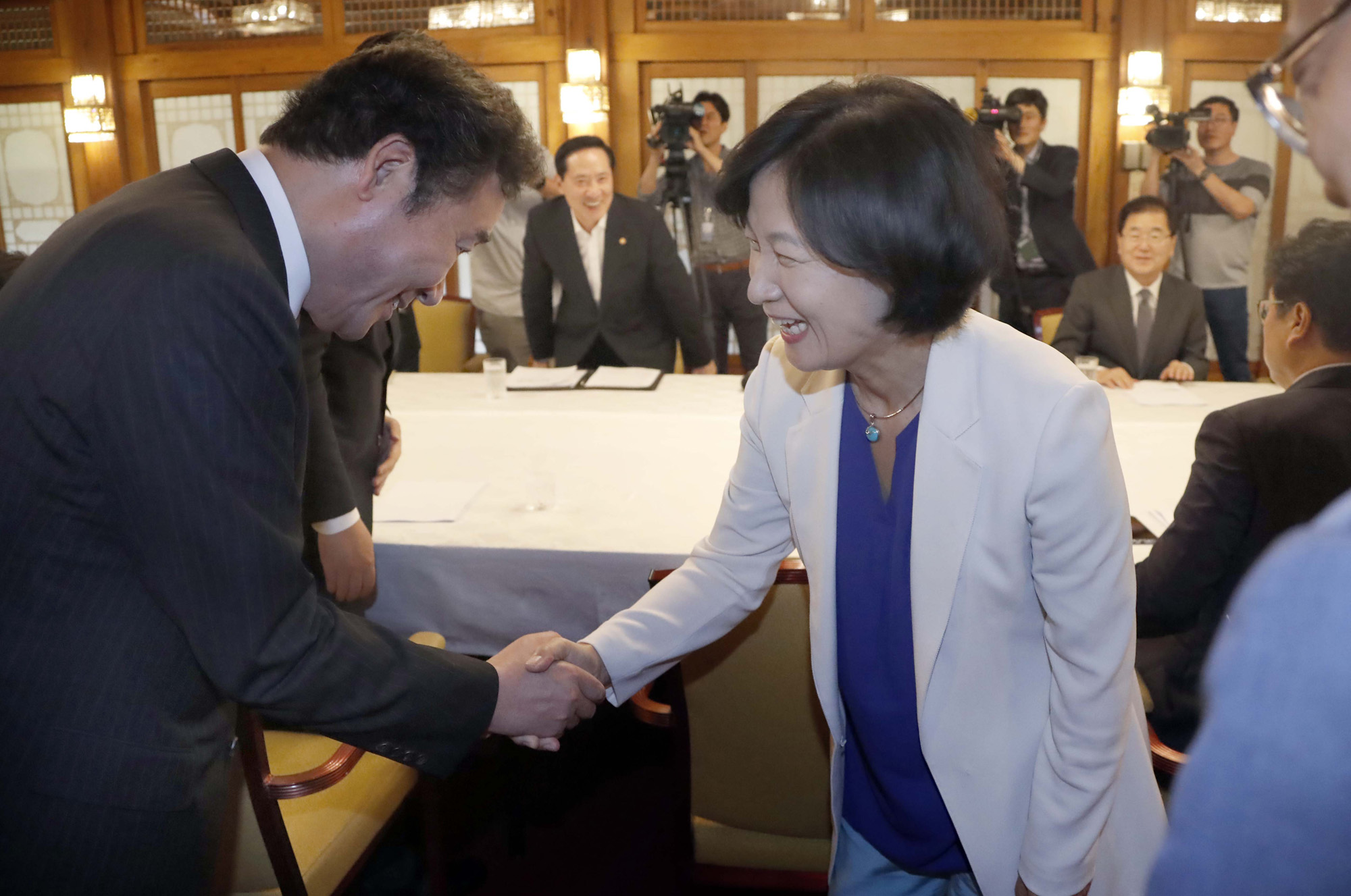 이낙연 국무총리와 더불어민주당 추미애 대표가 5일 오후 서울 삼청동 총리공관에서 열린 안보 관련 고위 당정청 회의에서 인사를 하고 있다. 2017.9.5