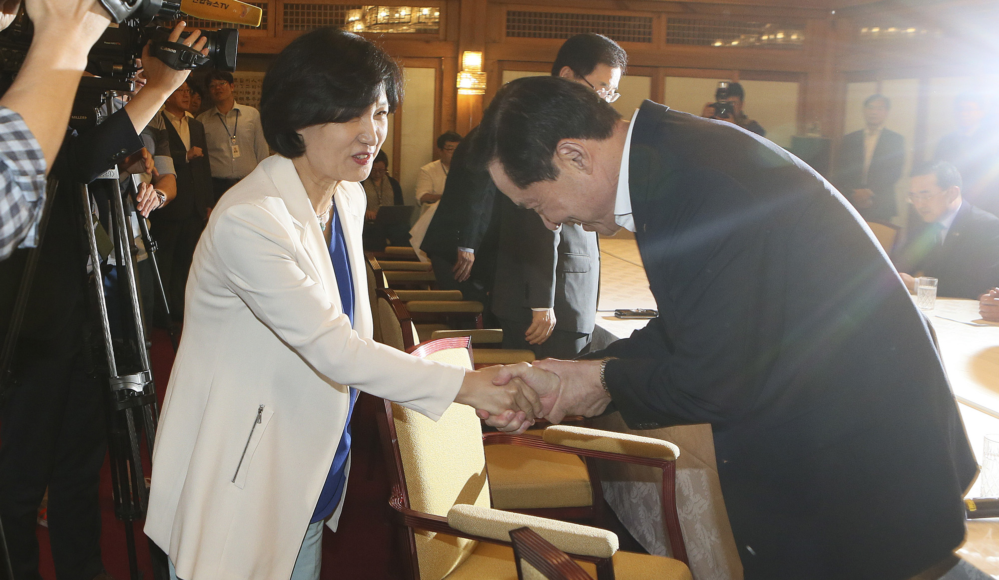 추미애 더불어민주당 대표가 5일 오후 서울 종로구 총리공관에서 열린 긴급 안보 당·정·청 회의에서 송영무 국방부장관과 악수하고 있다. /뉴스핌 이형석 2017.09.05.