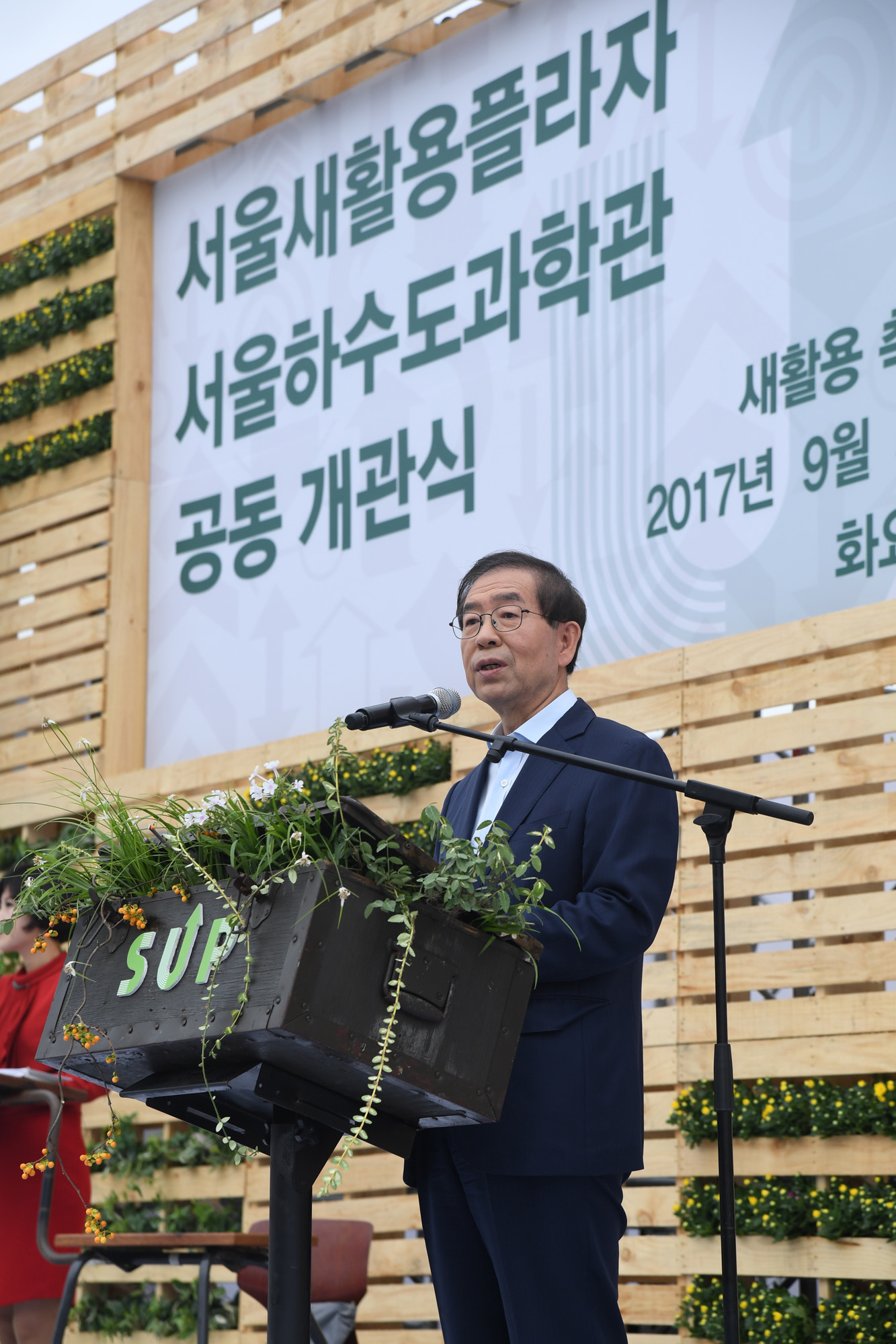 박원순 서울시장이 5일 오전 서울 성동구 용답동 중랑물재생센터 부지에서 열린 서울새활용플라자 개관식에서 축사를 하고 있다. 서울시 제공