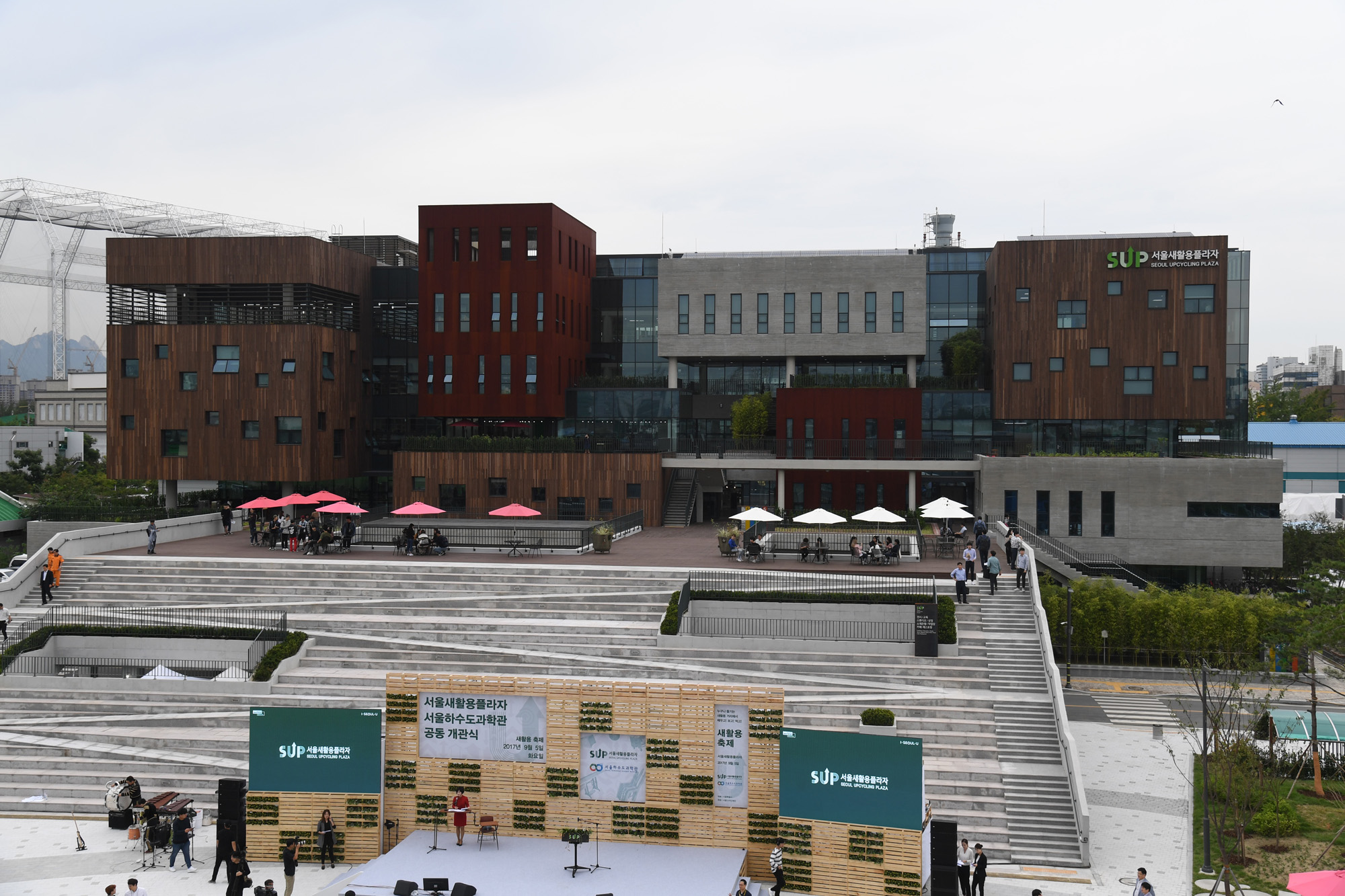 박원순 서울시장이 5일 오전 서울 성동구 용답동 중랑물재생센터 부지에서 열린 서울새활용플라자 개관식에서 축사를 하고 있다. 서울시 제공
