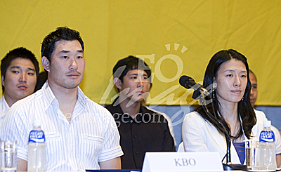 | 사진설명 | [서울=eoimage]박은숙기자= 스포츠토토에 대한 전자카드제 규제 도입을 놓고 체육계의 반발이 확산되고 있는 가운데 21일 오전 서울 소공동 웨스틴조선호텔에서 열린 '전자카드 도입 반대 프로스포츠 선수단 공동성명 발표 기자회견'에서 6개 프로스포츠 대표 선수들이 포즈를 취하고 있다.2009.06.22.eomaster@eoimage.com(끝) |