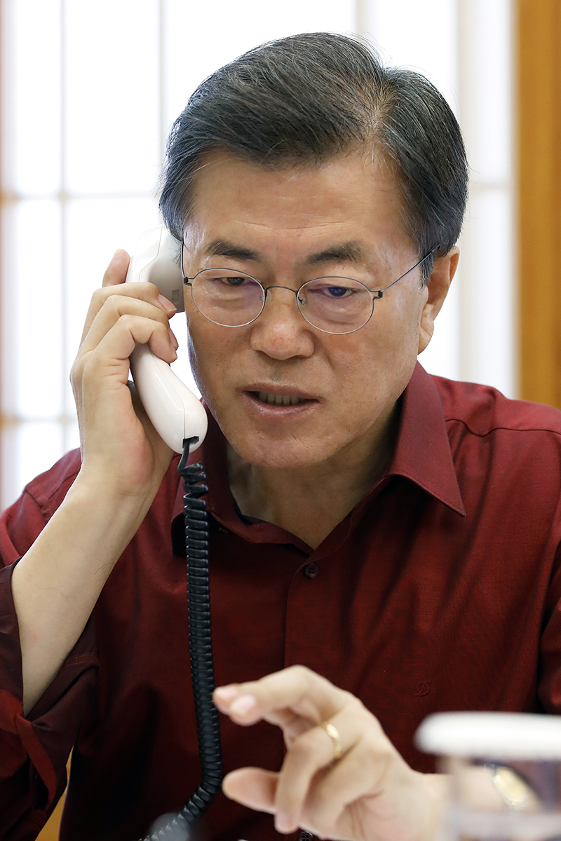 문재인 대통령이 17일 오전 관저에서 도널드 트럼프 미국 대통령과 통화하고 있다. 2017.9.17