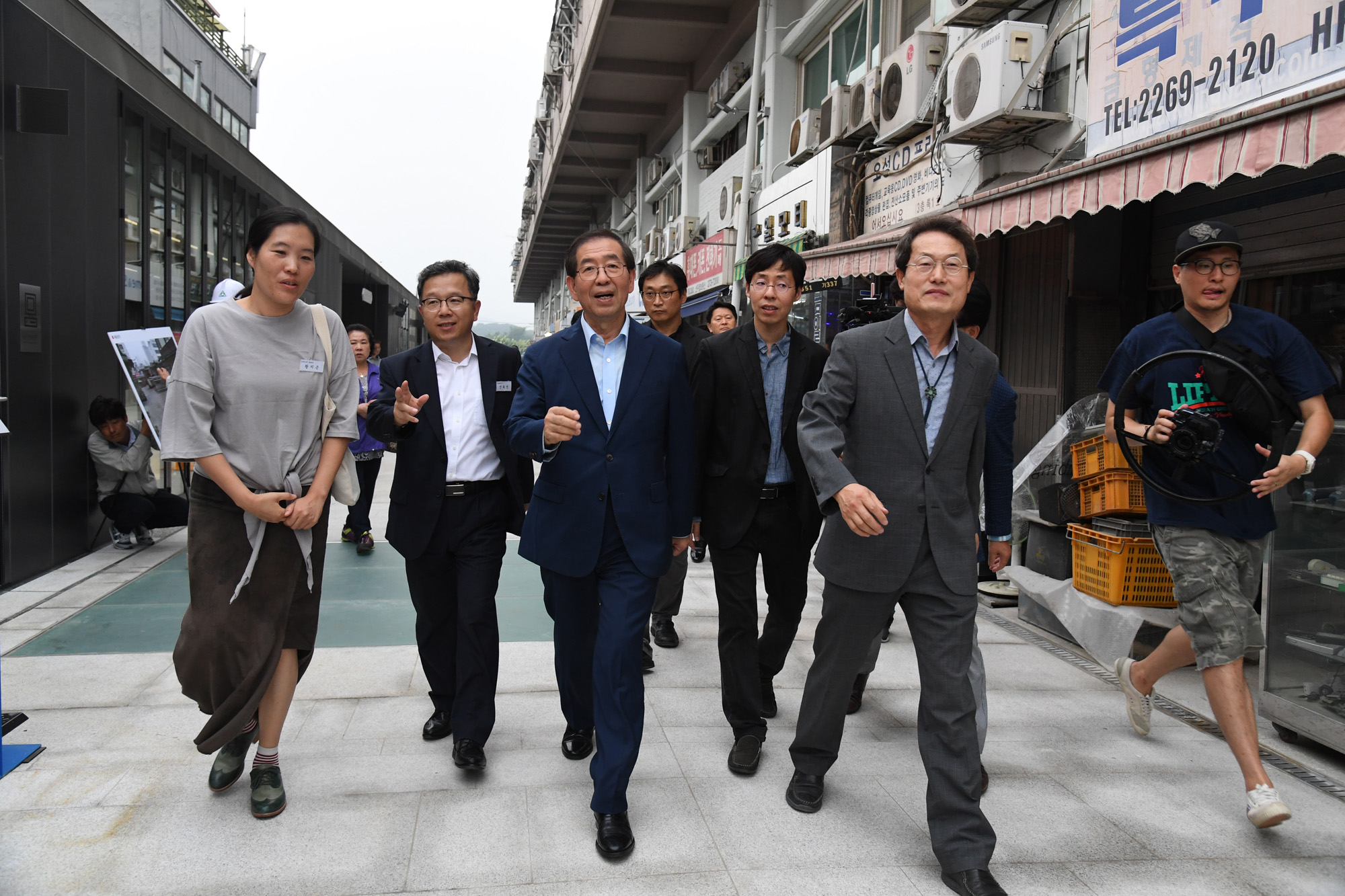 | 사진설명 | 70년대 전기·전자 산업의 메카로 불렸던 서울 종로구 세운상가가 19일 서울시의 세운상가 재생사업인 '다시 세운 프로젝트'의 1단계 공사를 마무리하고 50년 만에 새롭게 태어난 가운데 박원순 서울시장이 세운상가를 방문해 박정희 전 대통령이 1967년 11월 17일에 섰던 자리에서 관계자들과 이야기를 나누고 있다. 서울시 제공 |