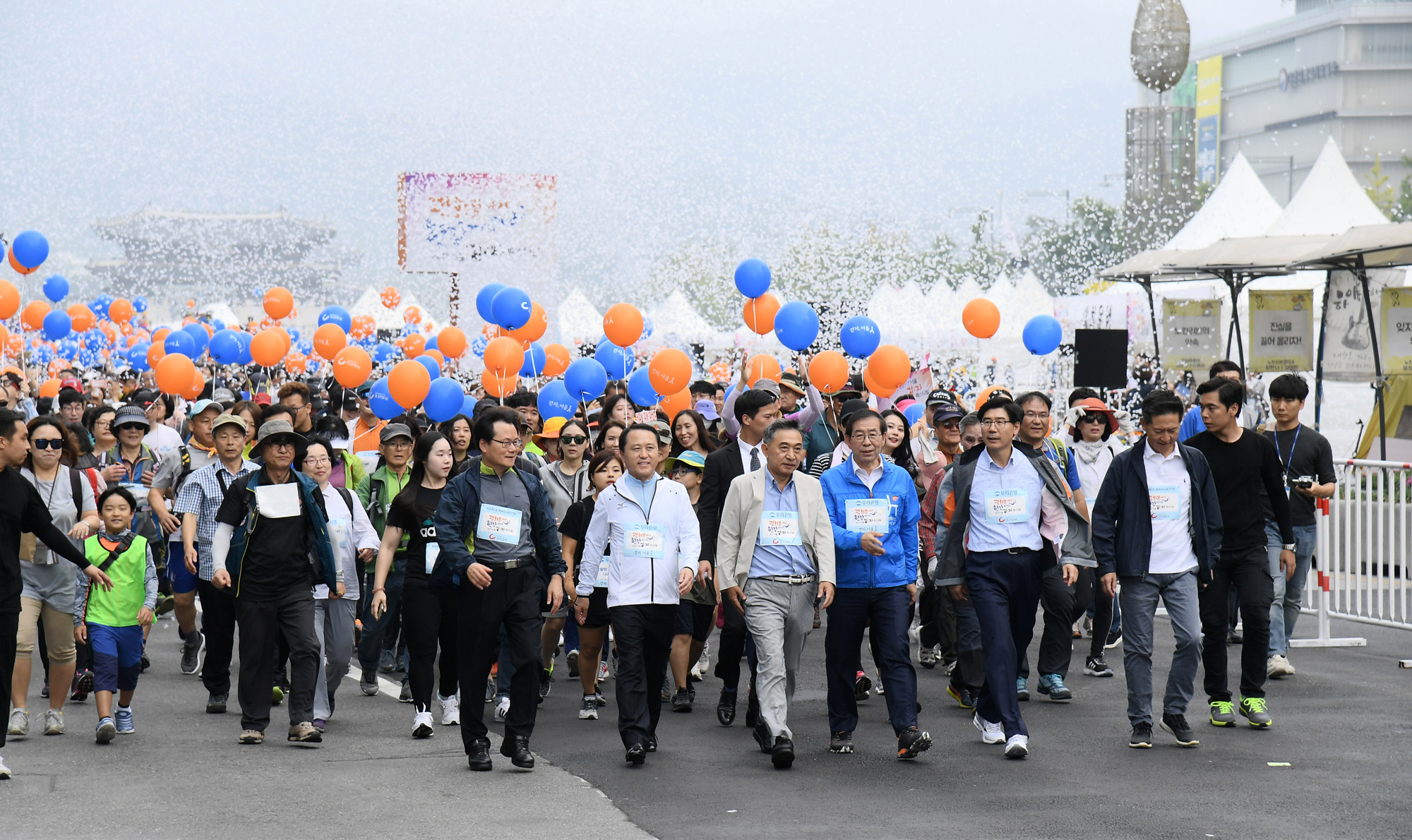 박원순 서울시장이 24일 오전 '2017 서울 걷자 페스티벌'에서 참가자들과 함께 광화문광장을 출발하고 있다. 서울시 제공