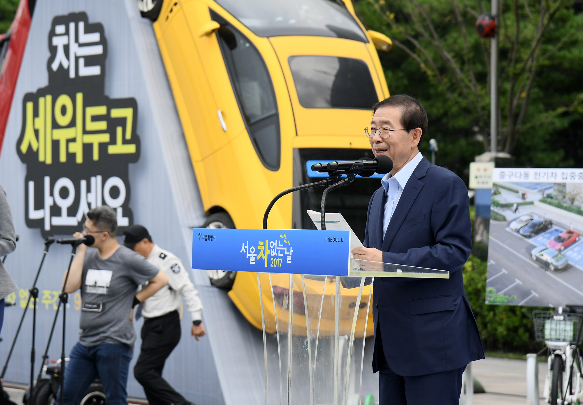 박원순 서울시장이 24일 오전 서울 세종대로에서 열린 ‘서울 차 없는 날 2017’ 기념식에서 인사말을 하고 있다. 서울시 제공