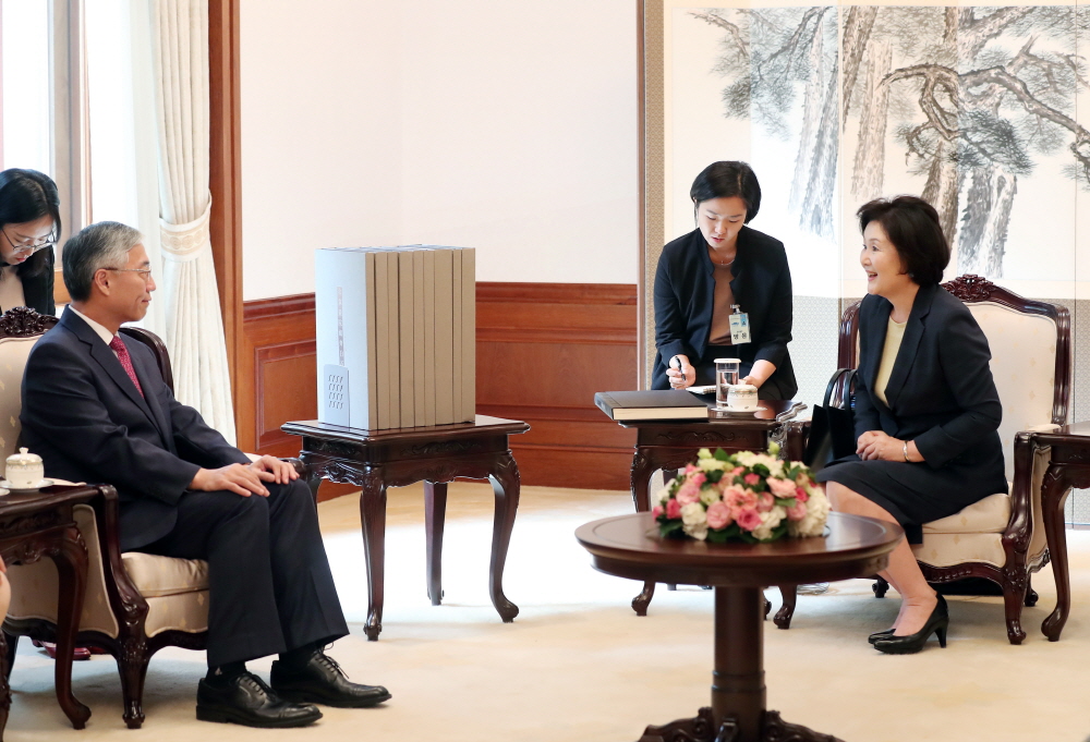 문재인 대통령 부인 김정숙 여사가 27일 오후 청와대 본관 접견실에서 추궈홍 주한중국대사와 리산 대사 부인을 접견하고 있다. 2017.9.27