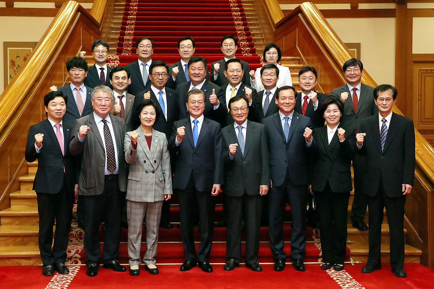 문재인 대통령이 13일 오후 추미애 대표를 비롯한 더불어민주당 지도부·시도당위원장 초청 만찬에 앞서 청와대 본관 로비에서 기념촬영을 하며 파이팅하고 있다.