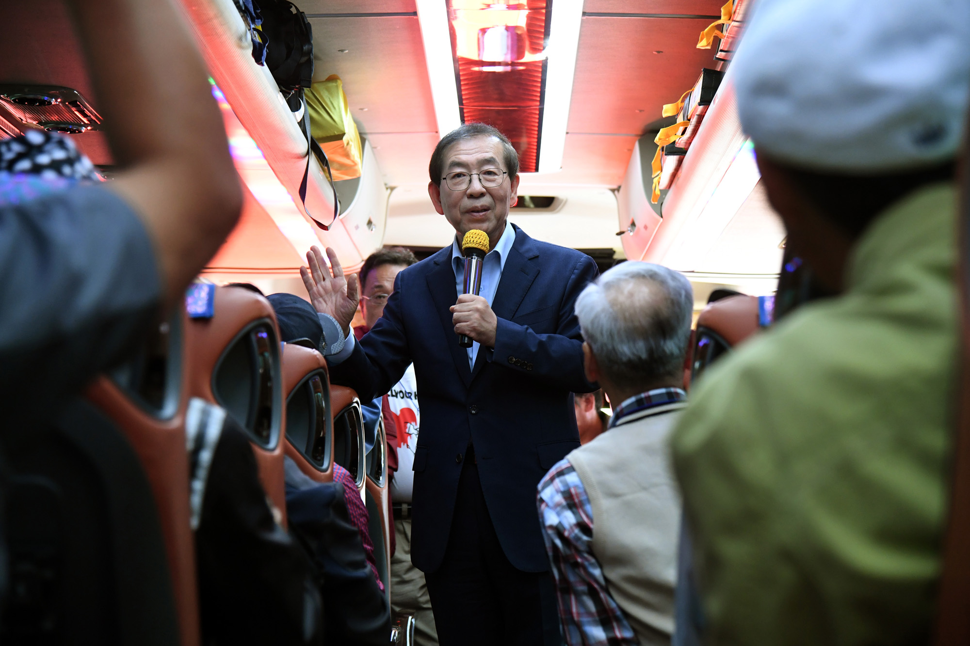 추석을 이틀 앞둔 2일 오전 서울 중구 서울광장 서편에서 열린 쪽방촌 주민 버스 환송식에서 박원순 서울시장이 고향으로 가는 쪽방촌 주민들에게 인사를 하고 있다. 서울시 제공