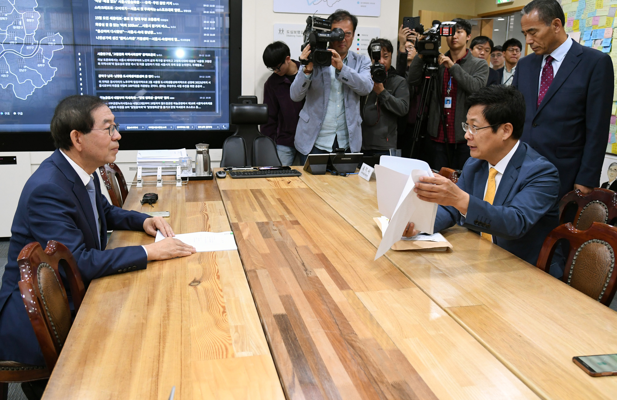 이명박 정부 시절 국가정보원이 야당 소속 지방자치단체장들을 사찰했다는 의혹과 관련해 12일 최성 고양시장과 박원순 서울시장이 서울시청에서 만나 대응방안을 논의하고 있다. 서울시 제공