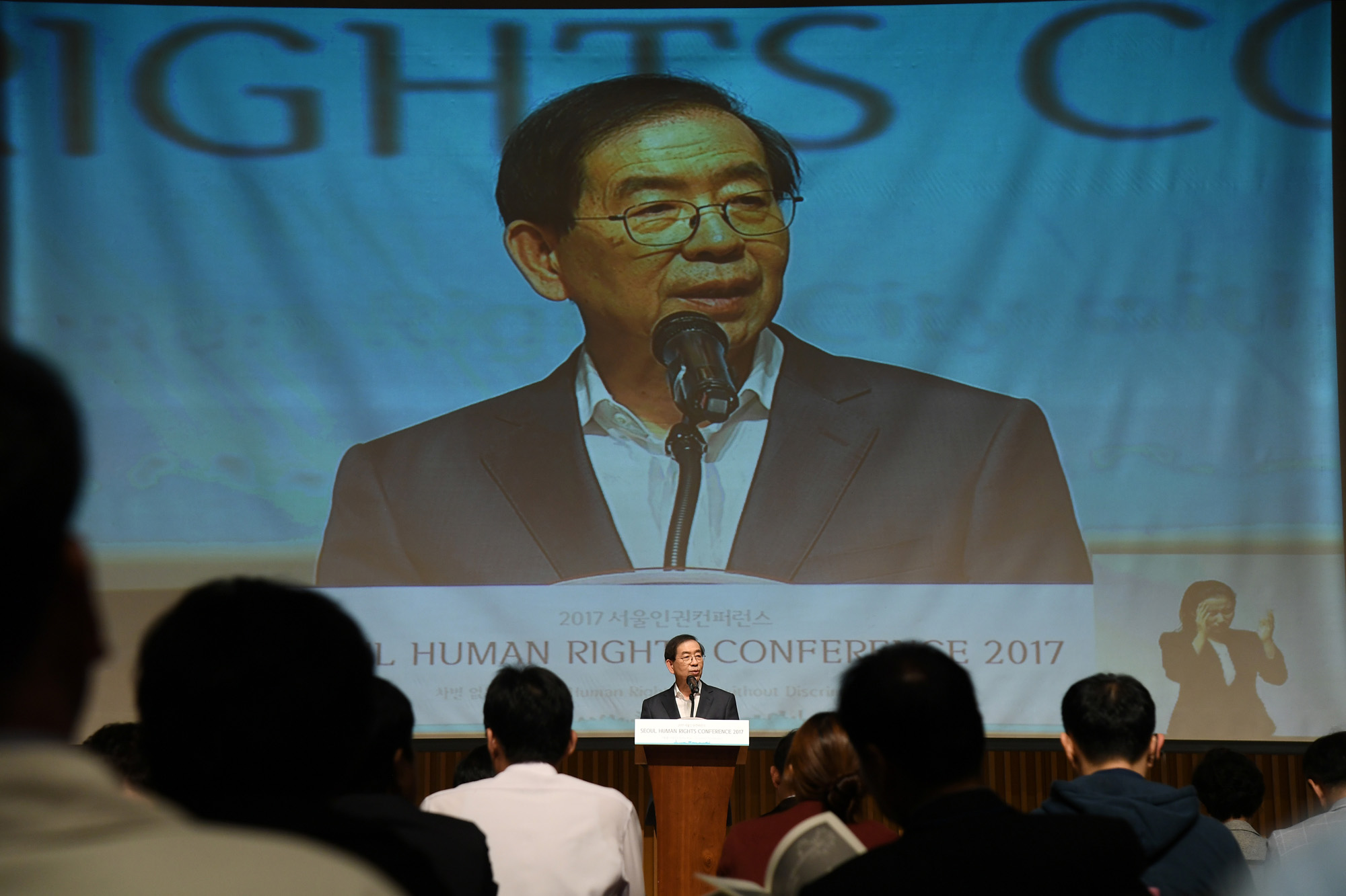 박원순 서울시장이 16일 서울 중구 서울시청에서 열린 서울인권컨퍼런스 개회식에서 환영사를 하고 있다. 서울시 제공