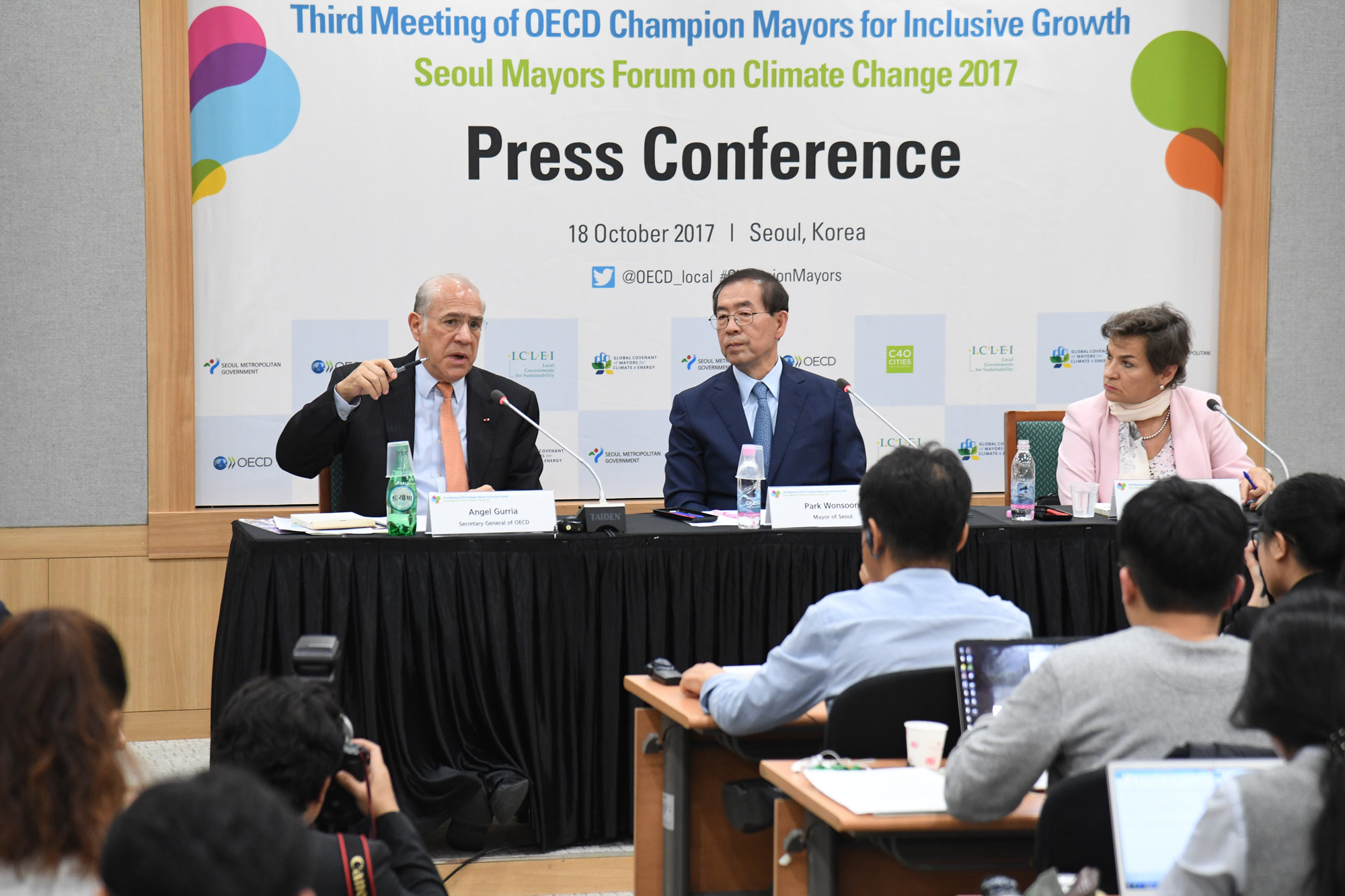 박원순 서울시장이 18일 오후 서울시청에서 앙헬 구리아(왼쪽) OECD사무총장, 크리스티아나 피게레스 글로벌 기후에너지 시장서약 이사회 부의장(전 유엔기후변화협약 사무총장)과 공동기자회견을 하고 있다. 이들은 기자회견에서 '제3차 OECD 포용적 성장을 위한 챔피언 시장 회의'와 '2017 기후변화 대응 세계도시 시장포럼'에 앞서 두 행사의 배경 등을 설명하며 포용적 성장과 기후변화 대응의 중요성을 강조했다. 서울시 제공 |