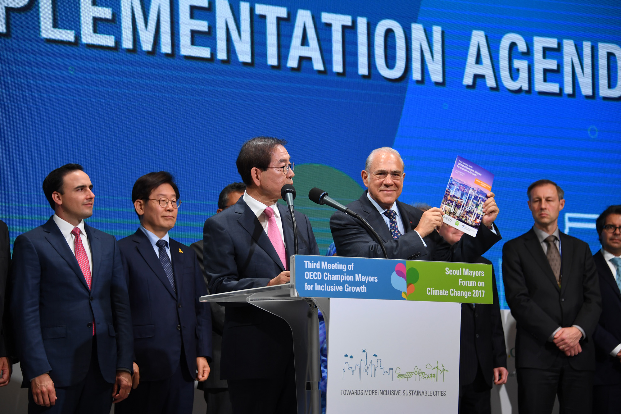 19일 오전 서울 영등포구 여의도 콘래드 호텔에서 열린 제3차 OECD 포용적 성장을 위한 챔피언 시장회의에서 박원순 서울시장이 '서울선언문'을 발표하고 있다. 서울시 제공