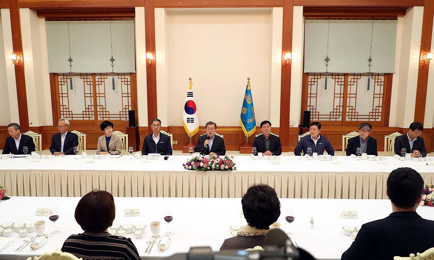 문재인 대통령이 24일 저녁 청와대 본관 충무실에서 노동계 인사들과 만찬을 갖고 있다. 2017.10.24 1부) 김영주 고용노동부 장관, 문성현 경제사회발전노사정위원장, 김주영 한국노총 위원장, 김명환 한국노총 부위원장, 최종진 민주노총 위원장 직무대행, 김종인 민주노총 수석부위원장 직무대행 2부) 핸즈식스노조, 국회환경미화원노조, 자동차노련, 금융노조, SK하이닉스, 영화산업노조, 희망연대노조, 서울지하철노조, 정보통신산업노조, 보건의료노조, 청년유니온, 사회복지유니온 윤영인 핸즈식스 노조위원장, 김영숙 국회환경미화원노조위원장, 허정우 SK하이닉스 노조위원장, 안병호 영화산업노조 위원장, 박대성 희망연대노조위원장, 최병윤 서울지하철노조위원장, 김민수 청년유니온 위원장, 김준이 사회복지유니온 위원장 |