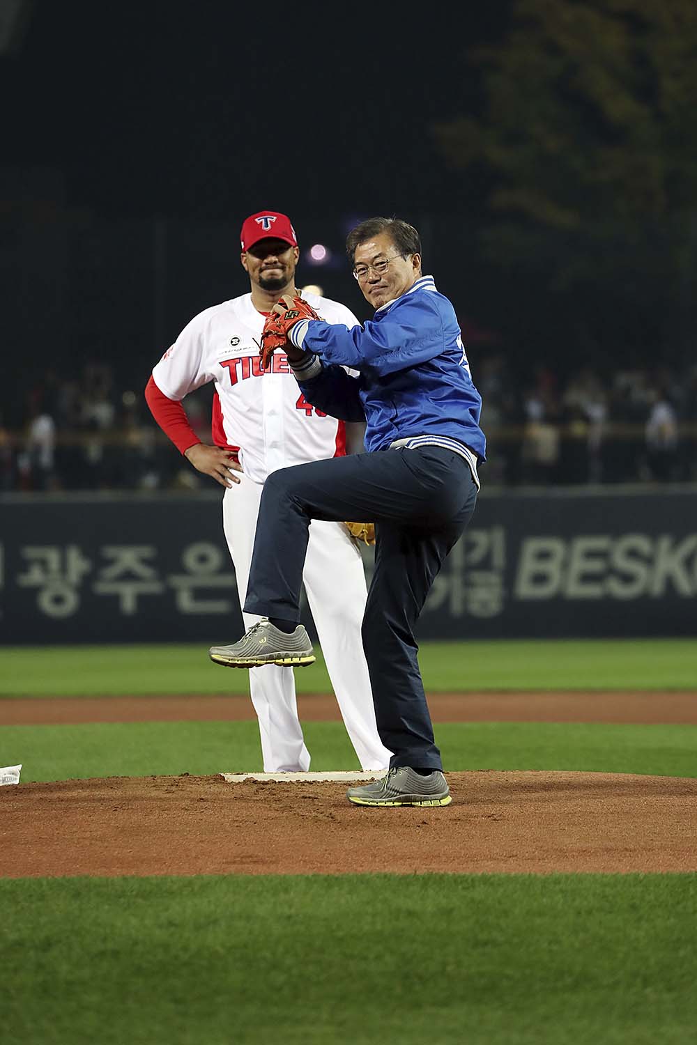 문재인 대통령은 25일 오후 광주-기아 챔피언스필드에서 열린 2017 프로야구 한국시리즈 1차전에서 시구를 하고 있다.