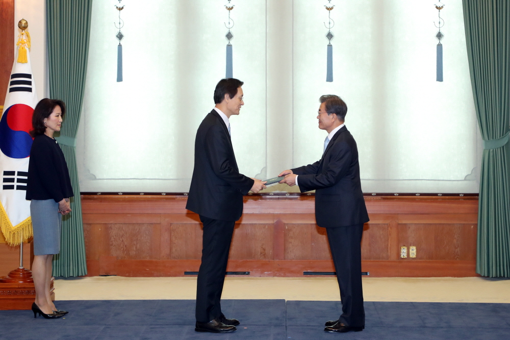 문재인 대통령이 25일 오전 청와대에서 이수훈 신임 주일본대사에게 신임장을 수여하고 있다.
