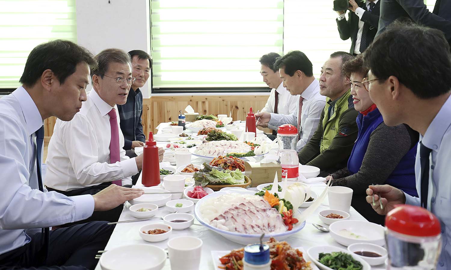 문재인 대통령이 26일 전남 여수에서 열린 제2회 시·도지사 간담회 및 제5회 지방자치 박람회 기념식을 마친 뒤 여수 수산시장을 방문해 상인들과 함께 식사를 하고 있다.